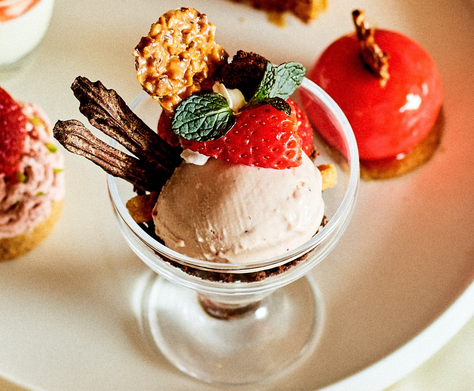 いちごのアイスクリームとフレッシュないちごをトッピングし、ほろ苦い焼きショコラと濃厚なガトーショコラを合わせました。それぞれのチョコレートがいちごの甘酸っぱさと絶妙に溶け合い、一口ごとに異なる味わいと食感をお楽しみいただけます。