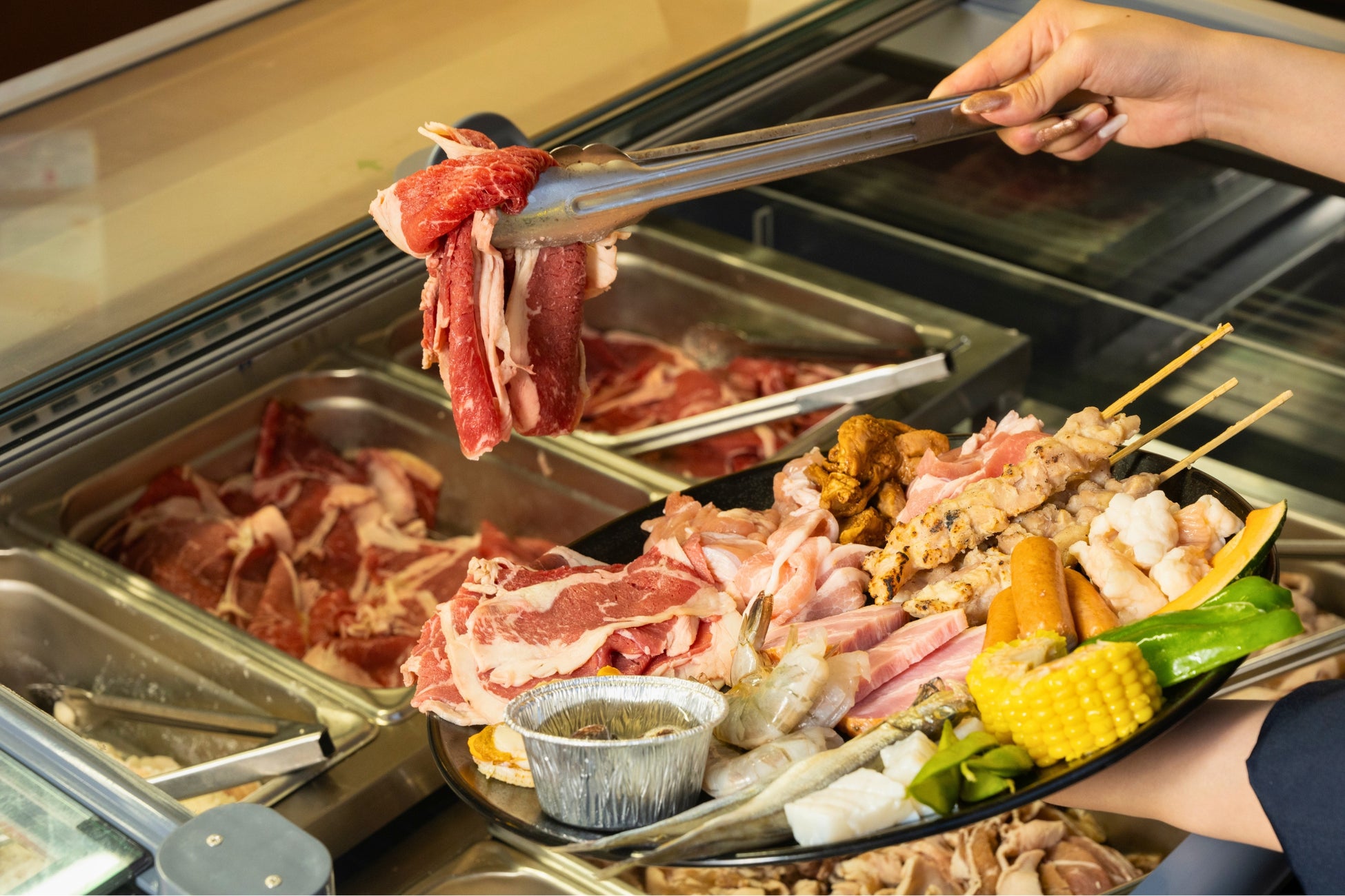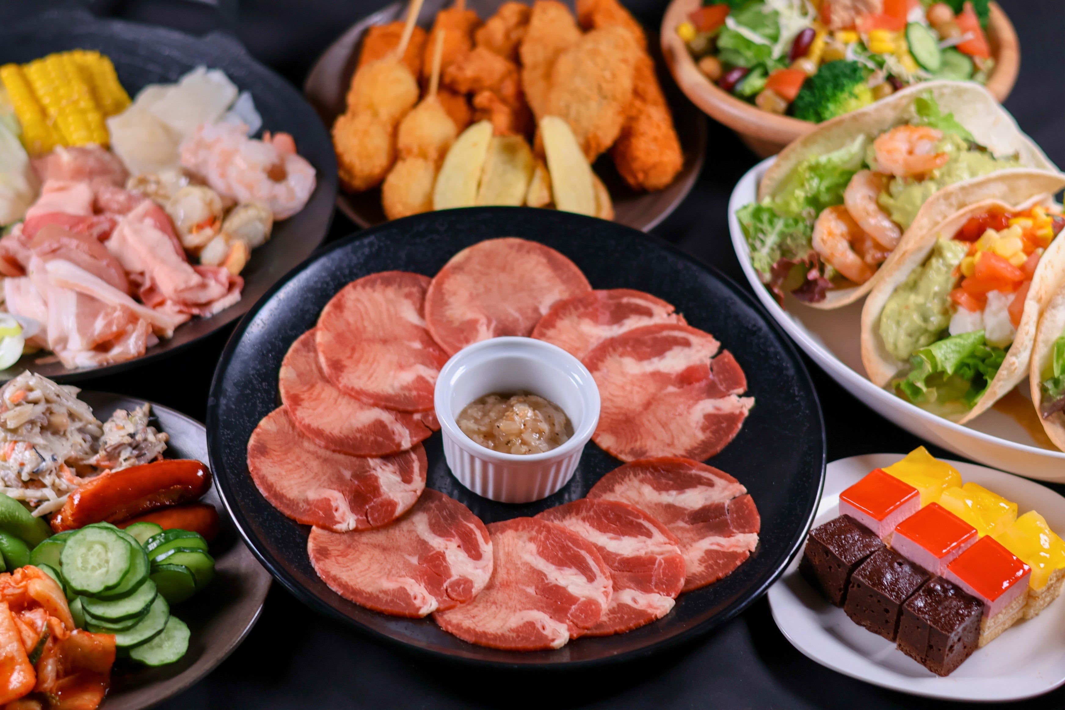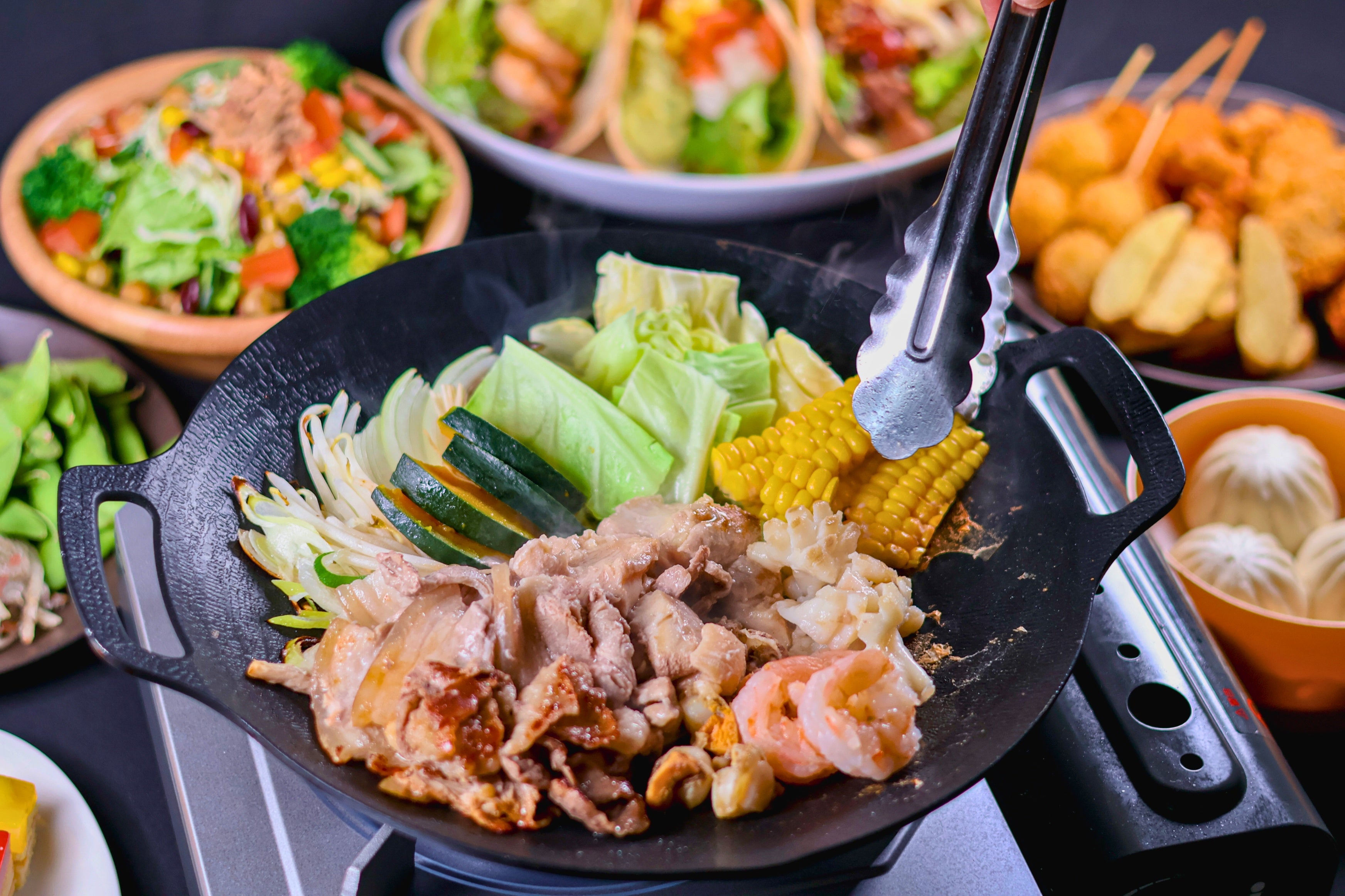 マルチグリドルで食材を焼きながら楽しむスタイルで、自分好みに調理するライブ感のある食体験が特徴です。スパイスや調味料も豊富に揃えており、味の変化を楽しみながら最後まで飽きずに楽しめます。そのほか惣菜やおつまみなど、手軽に楽しめるメニューも充実しています。