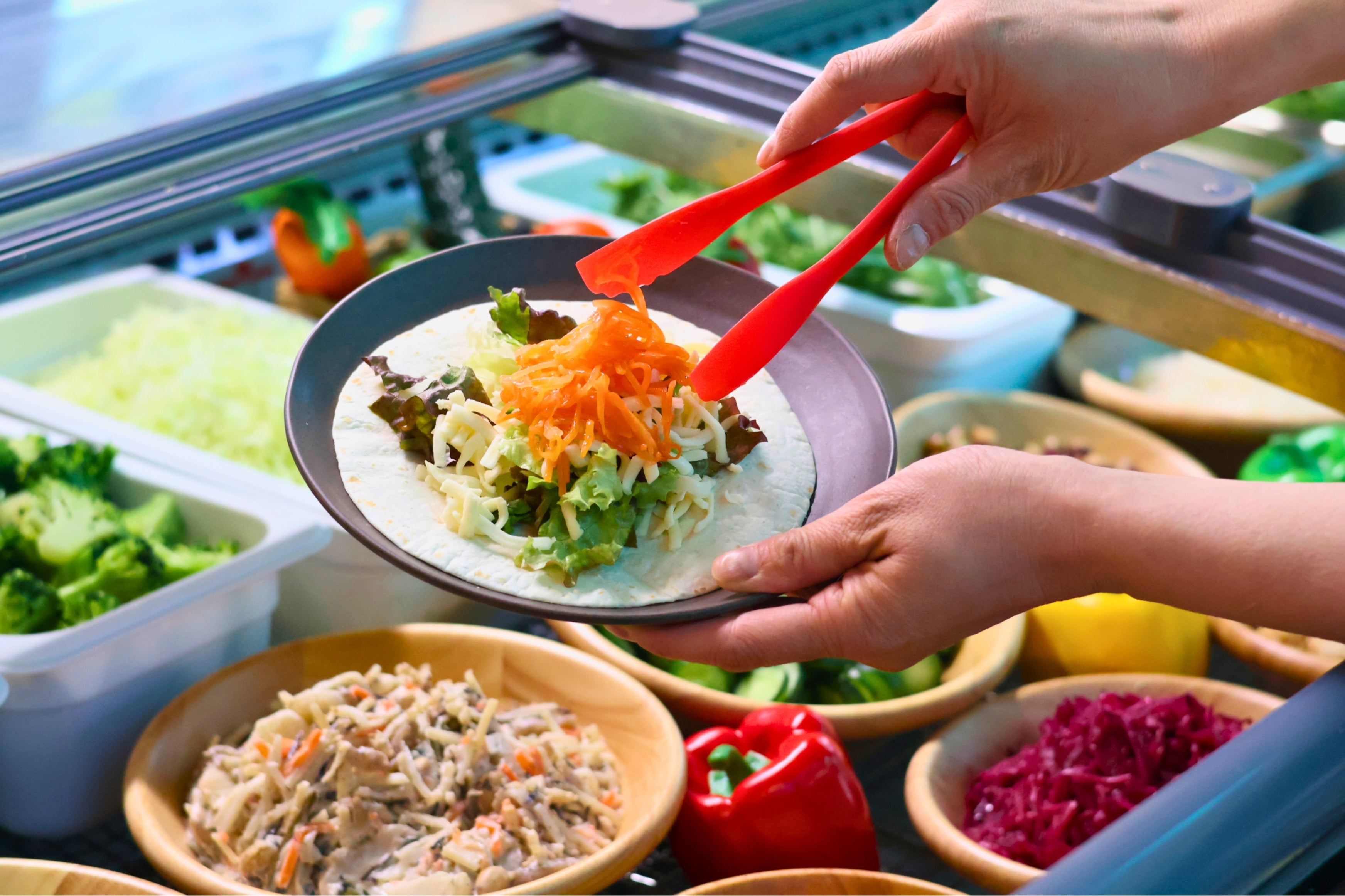 今回の注目コンテンツが、自由に作れるサラダ&タコスコーナーです。