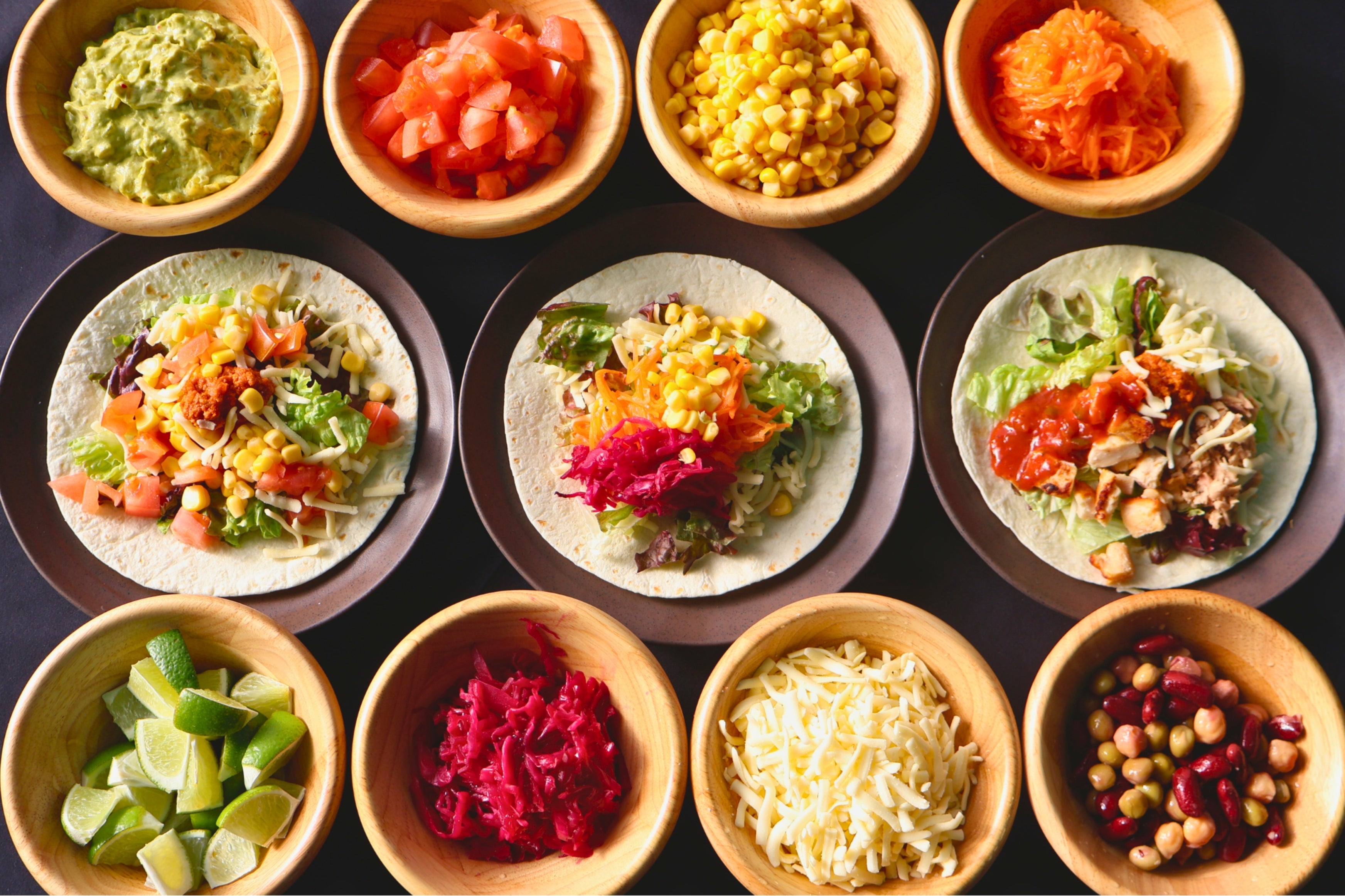 肉、野菜、ソースなどを自由に組み合わせ、自分だけの「MYタコス」を作ることができます。組み合わせは無限大。