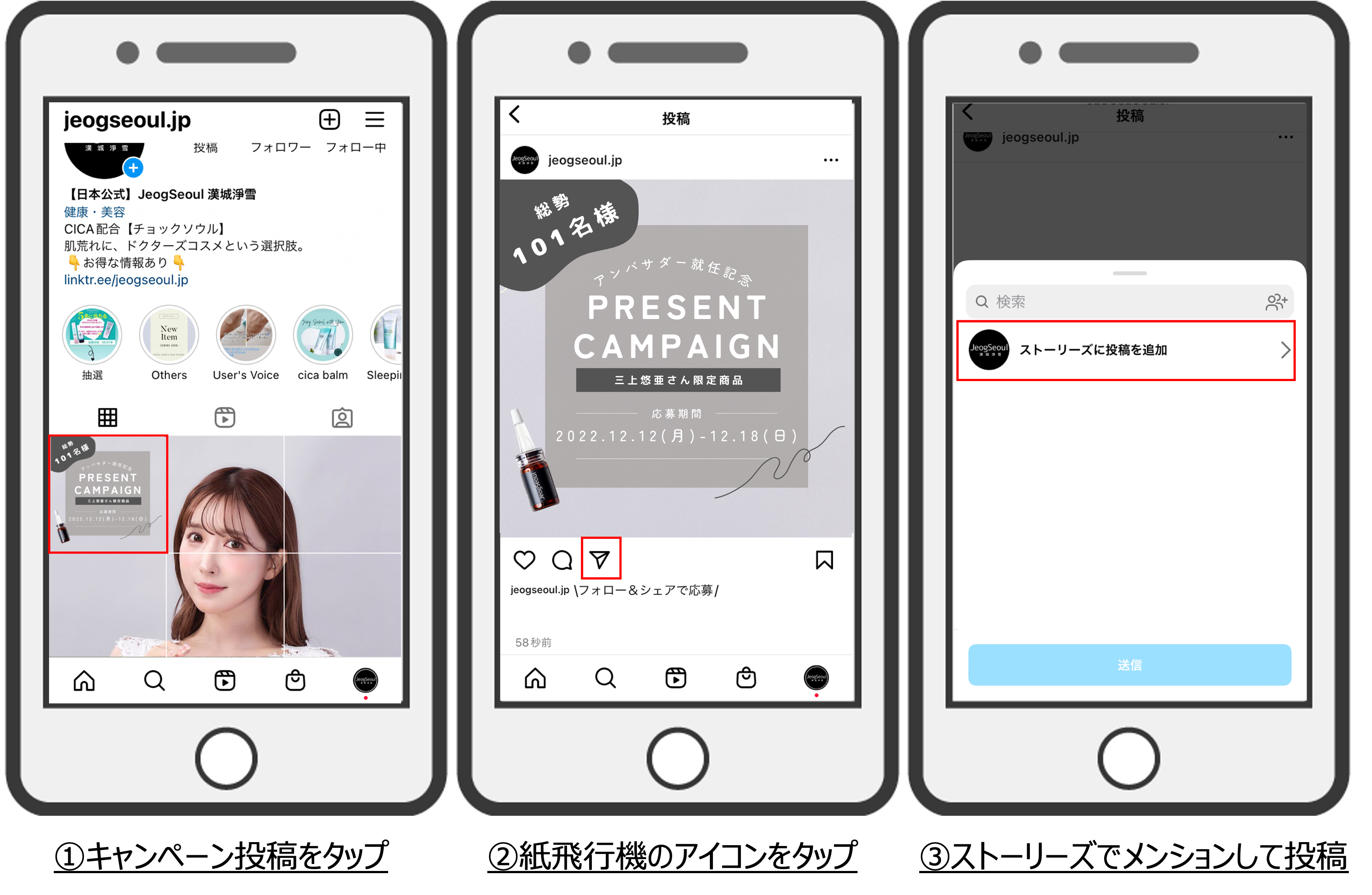 ・プレゼントキャンペーンの投稿を、ストーリーズで「@jeogseoul.jp」をメンションしてシェア。