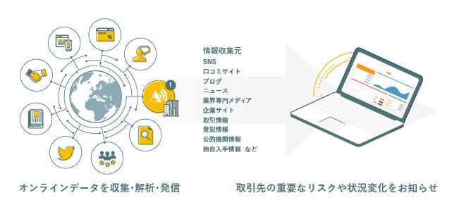 AI与信管理クラウドサービス「アラームボックス」( https://alarmbox.jp )は、スマートフォンやPCから取引先を登録しておくだけで、取引先のリスクや状況変化を自動で知らせてくれるクラウドサービスです。収集・判断の難しいネット上の情報を、与信への影響度を診断したうえでお届けするため、インターネット上の情報を活用した「高精度」な与信管理を、「カンタン」に、「低価格」で導入できます。それにより、取引先の情報収集に関わる業務負荷を大幅に削減し、信用状況の変化をいち早くキャッチして、リスクに迅速に対応できます。