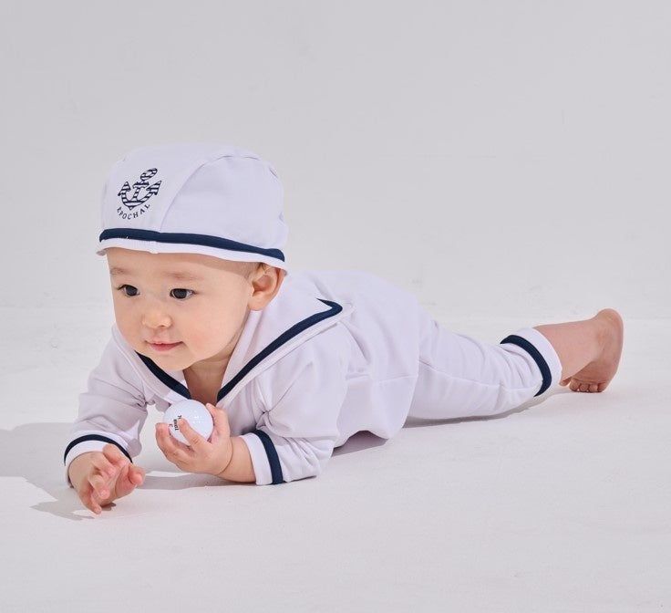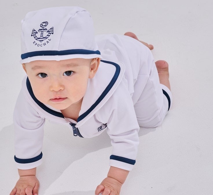 マリンスイムウエア&キャップはいかりマークをあしらった、ホワイト×ネイビーのマリンテイストが爽やかなパンツスーツタイプのラッシュガードとキャップのセット。抱っこしても、ハイハイしても、着崩れることなく0歳のおすわり時期から3歳くらいまで長くご着用いただけます。