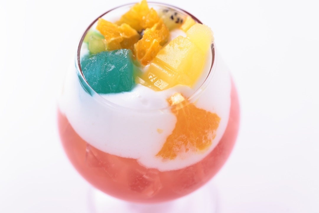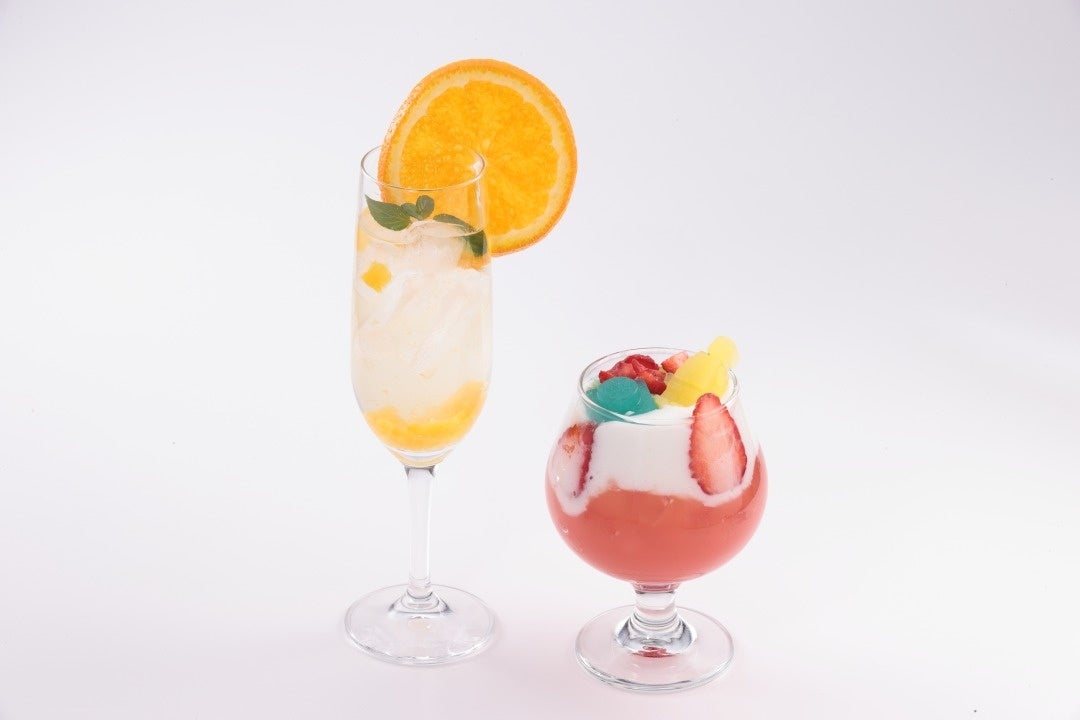 お花畑で遊んでいるミニフィギュアをイメージしたお⼦さま向けのドリンク