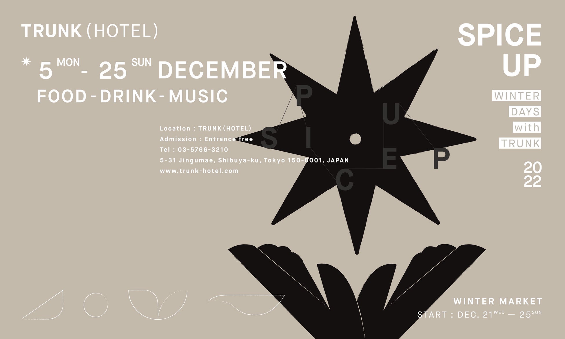 ※期間中最後の5日間(12月21日 - 25日)は、TRUNK(HOTEL)冬の恒例イベント「WINTER MARKET」も開催予定。TRUNK GARAGE SHOPと題した物販や、多様なワークショップ、スペシャルアーティストを迎えるLIVEなど、さまざまな企画をご用意してお待ちしています。