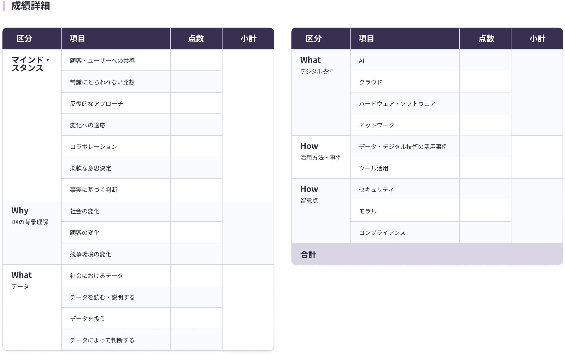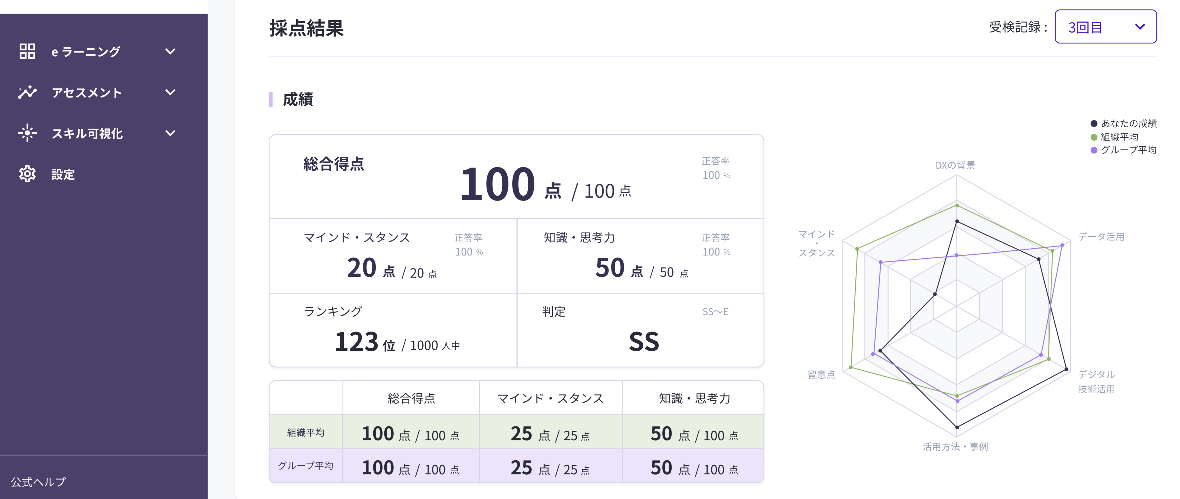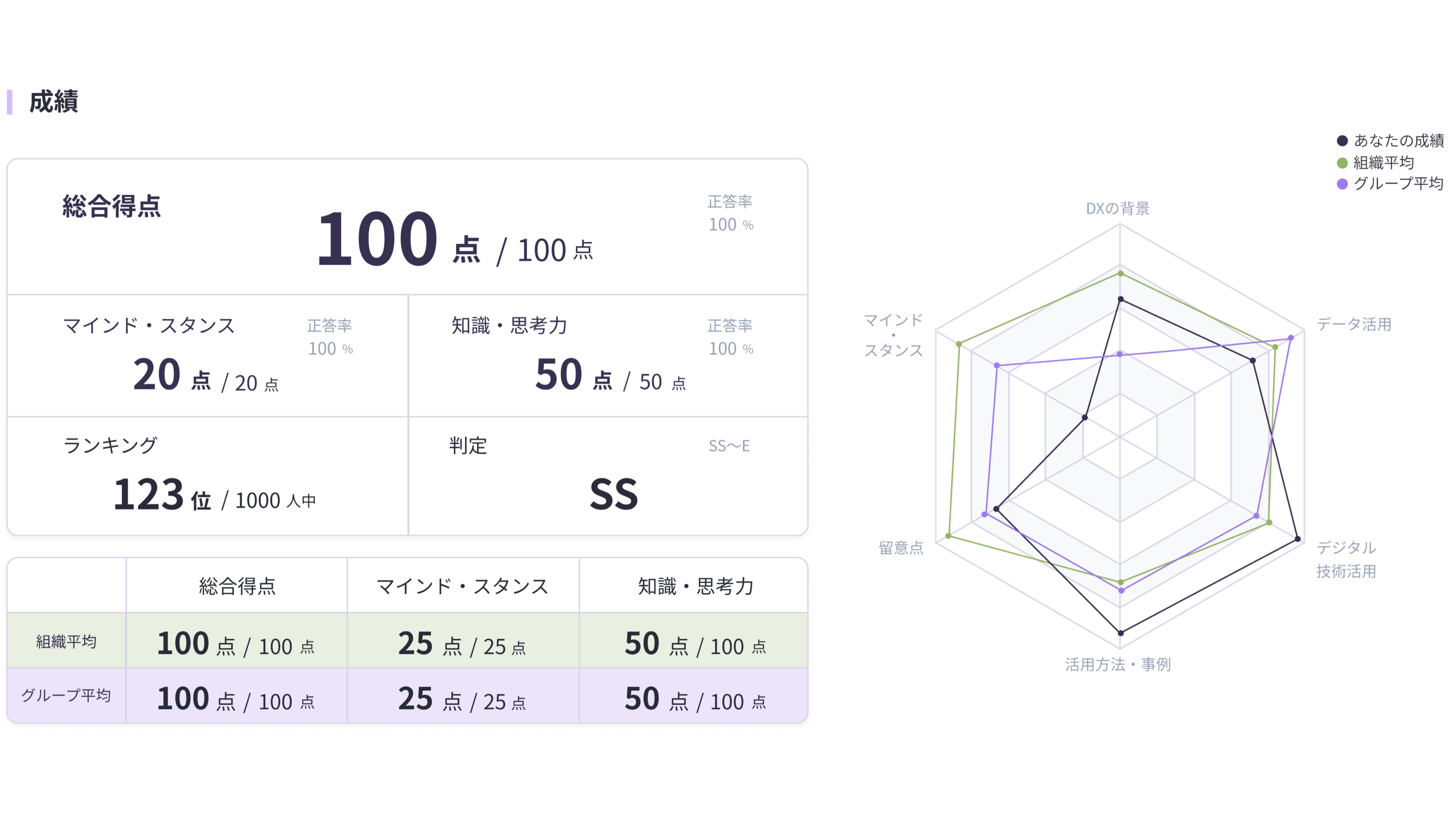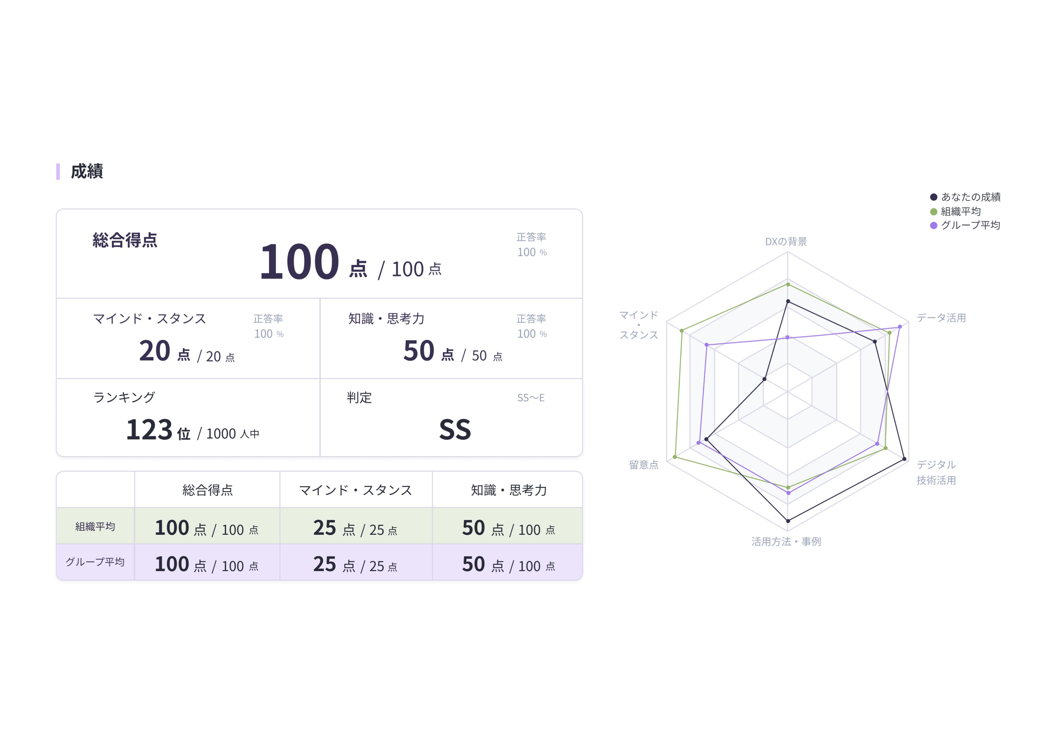 全社員の DX リテラシーレベルを可視化し、全社的な DX 推進人材育成を加速させます。