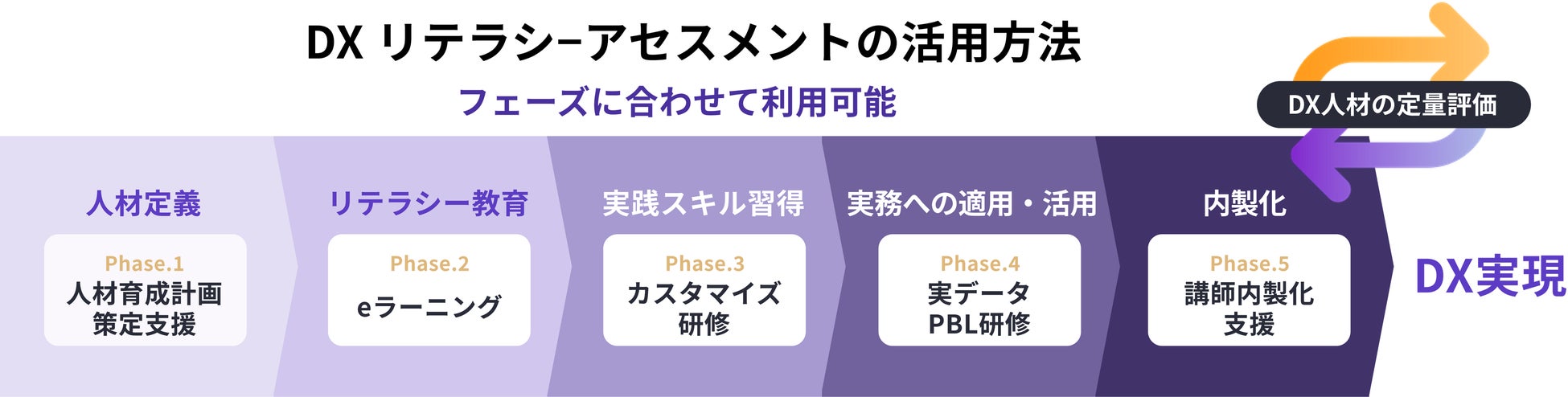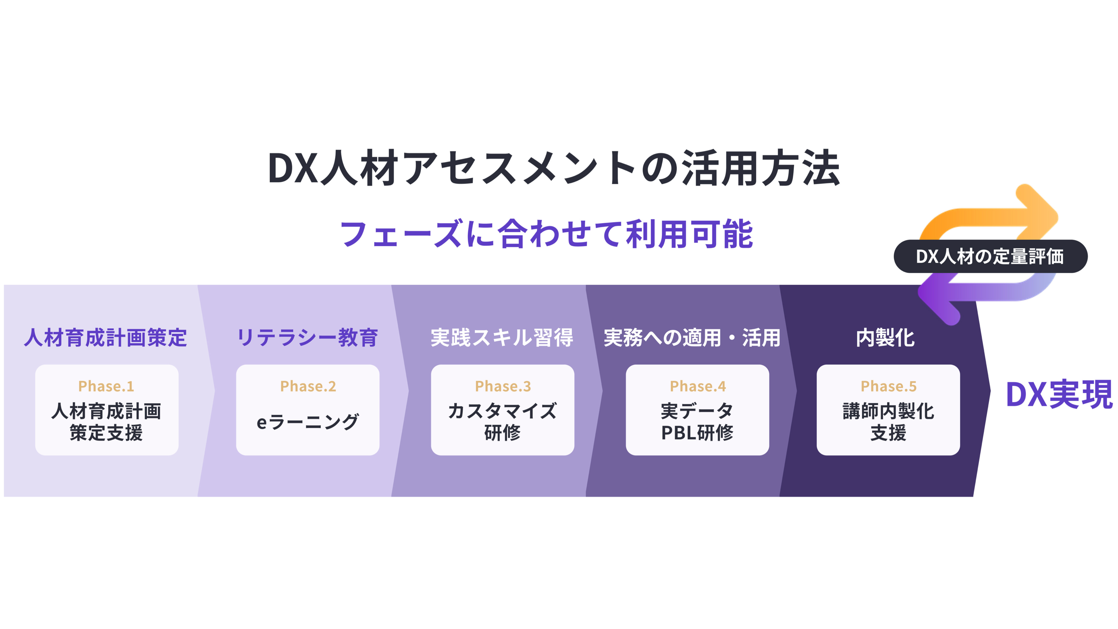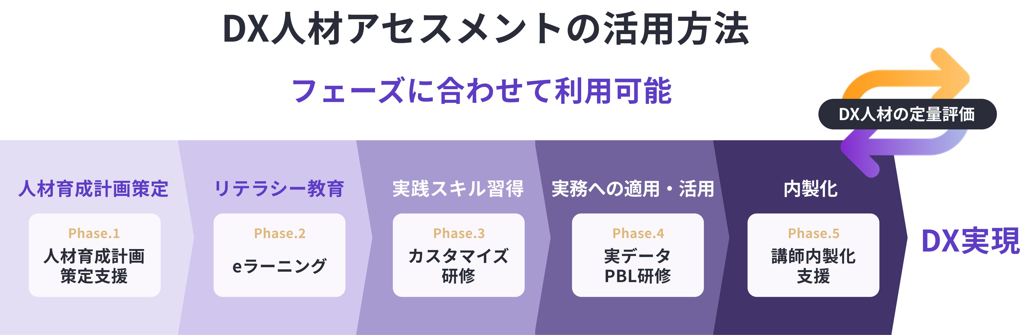 『全社員向け DX リテラシーアセスメント』は、DX 推進におけるどのフェーズでも導入することが出来ます。これから DX を進める企業には人材要件定義のためのツールとして、人材育成研修を終えた企業には、研修効果の測定ツールとして、アセスメントを利用頂けます。企業の推進フェーズに合わせて DX 人材の定量評価を実現することで、全社的な DX 推進を加速させます。