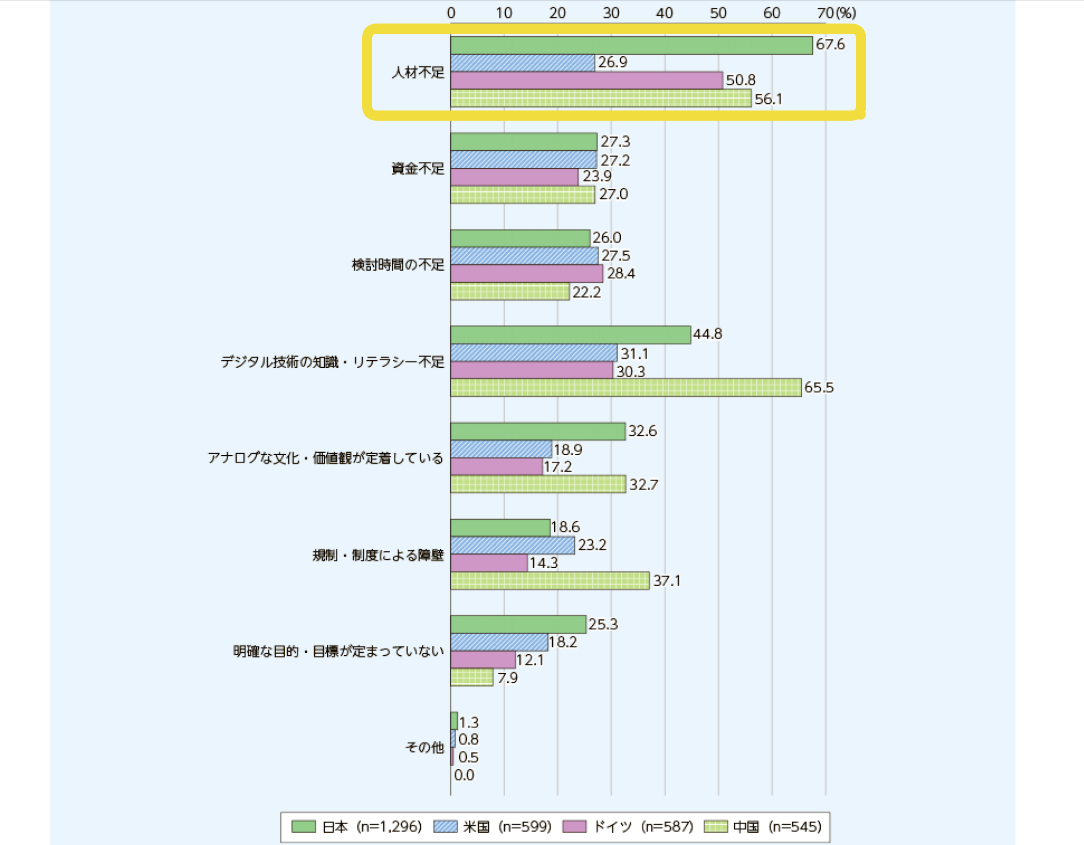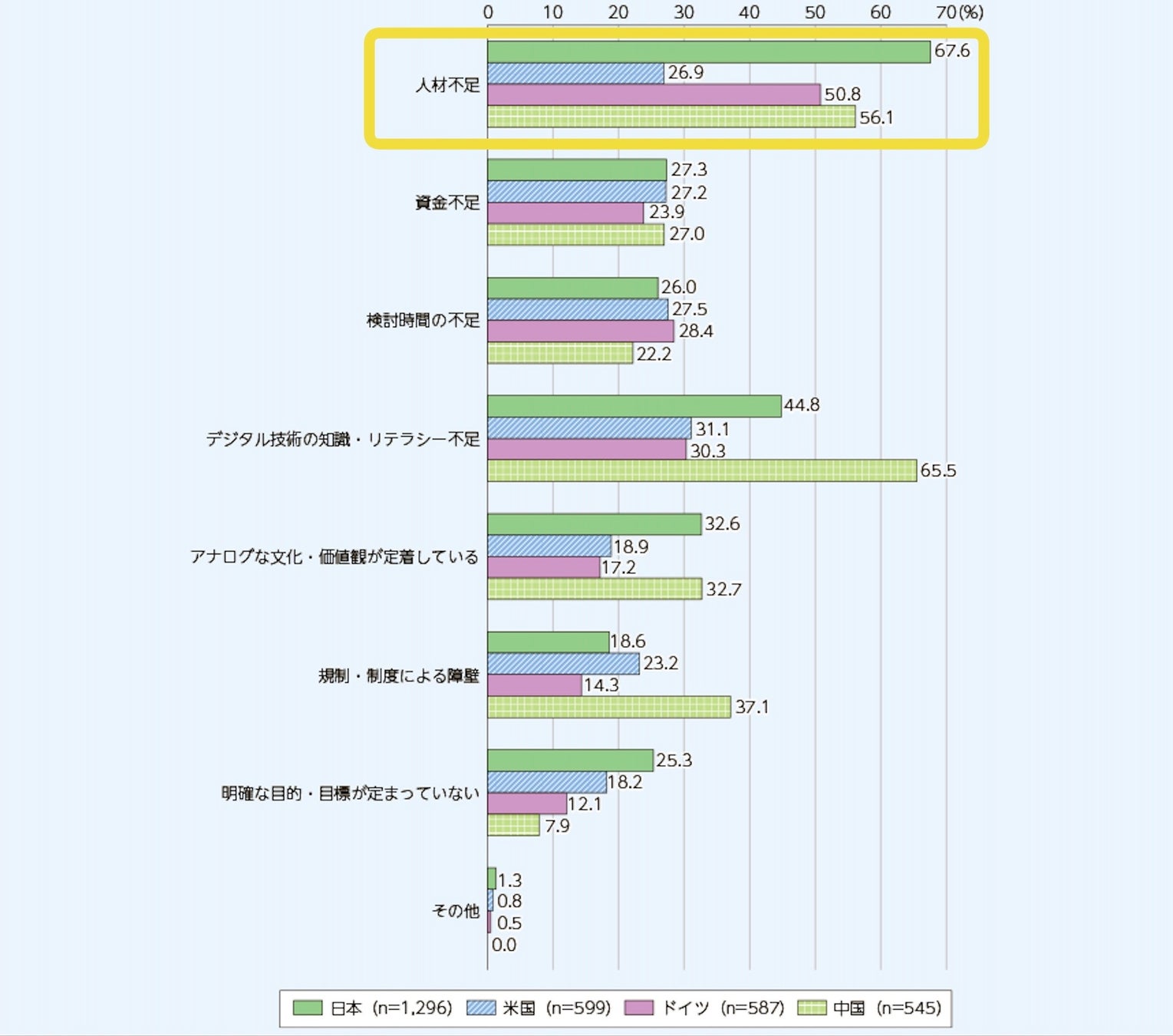総務省の調べによると、日本企業の 67.6% が DX 推進における課題に『人材不足』を挙げており、これは他の先進国と比べても深刻な状況です。こういった背景があるにも関わらず、企業の育成担当者からは『DX の必要性は理解しているが、必要な人材定義ができず、人材育成をうまく進められない』という声が多く寄せられています。これまで様々な企業から頂いてきたこのような声が、『全社員向け DX リテラシーアセスメント』の開発に繋がりました。
