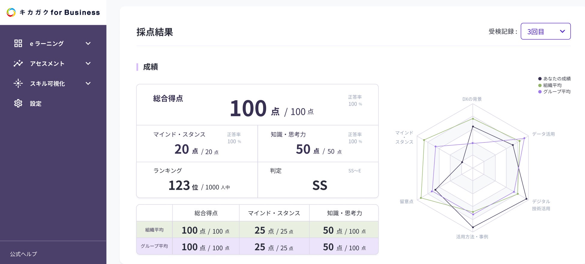 今回リリースする『全社員向け DX リテラシーアセスメント』は、組織・年代・職種を問わず全社員が、DX リテラシーレベルを定量的に測定できるテストです。個人の現状のリテラシーレベルを可視化することで、必要な人材要件を定義できるようになり、人材育成のための研修を効果的に行うことが可能です。尚、サービスはキカガクが提供する DX 人材ラーニング・アセスメントプラットフォーム「キカガク for Business」上で利用できます。