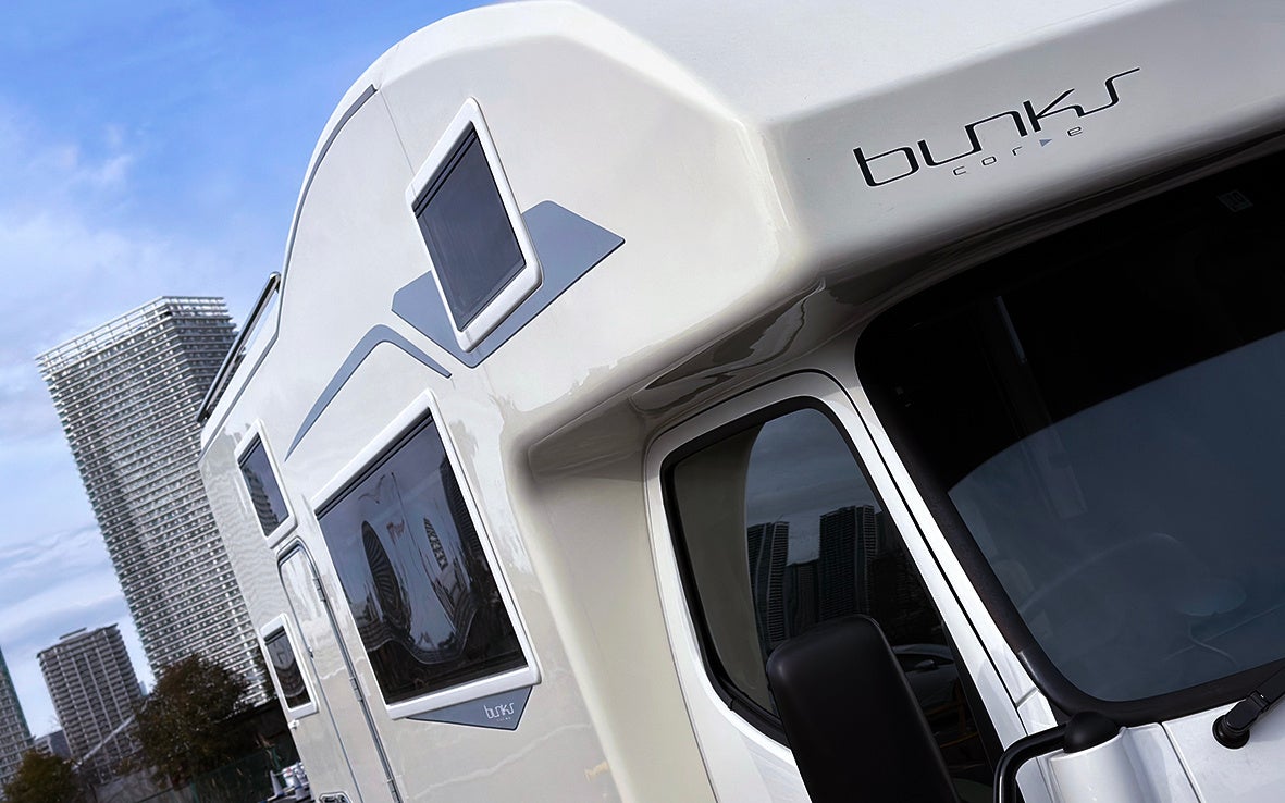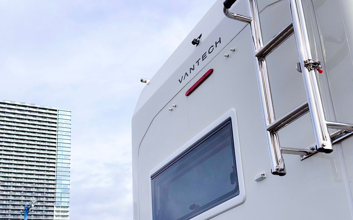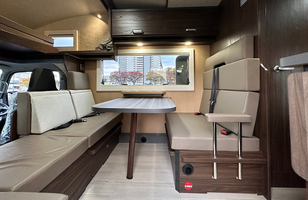 キャブコンで国内トップクラスのシェアを誇るバンテックのキャンピングカーは、デザイン哲学に基づいた機能美が特徴です。光の使い方まで計算し尽くした特別な室内空間で、乗車定員の6名(就寝定員は5名)が快適にお過ごしいただけます。また、剛性を強化した独自の「ソリッドスクエアフレーム」を採用し、高速道路やカーブでの走行安定性を高めるなど機能性と安全面の両立も実現しています。