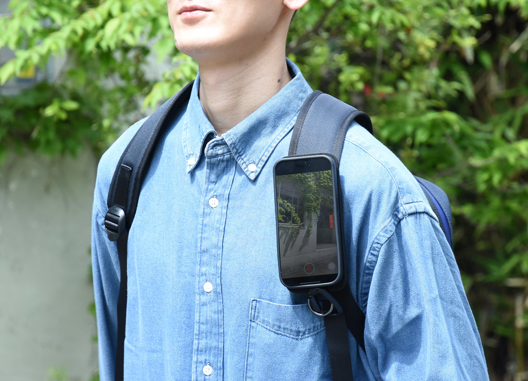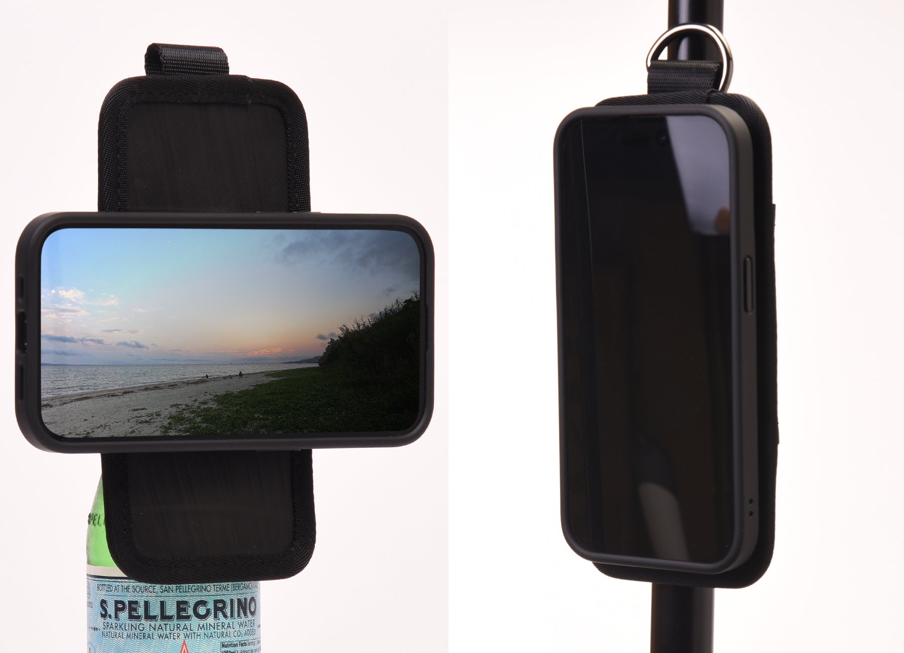 このベルトホルダーはあらゆる太さのショルダーベルトにしっかりと固定する事ができ、例えばハンズフリーで歩きながらの撮影が可能です。また、ポールやペットボトルなどを利用してスマートフォンを固定したりする事もできるなどユーザーのアイディア次第で幅広い使い方ができます。