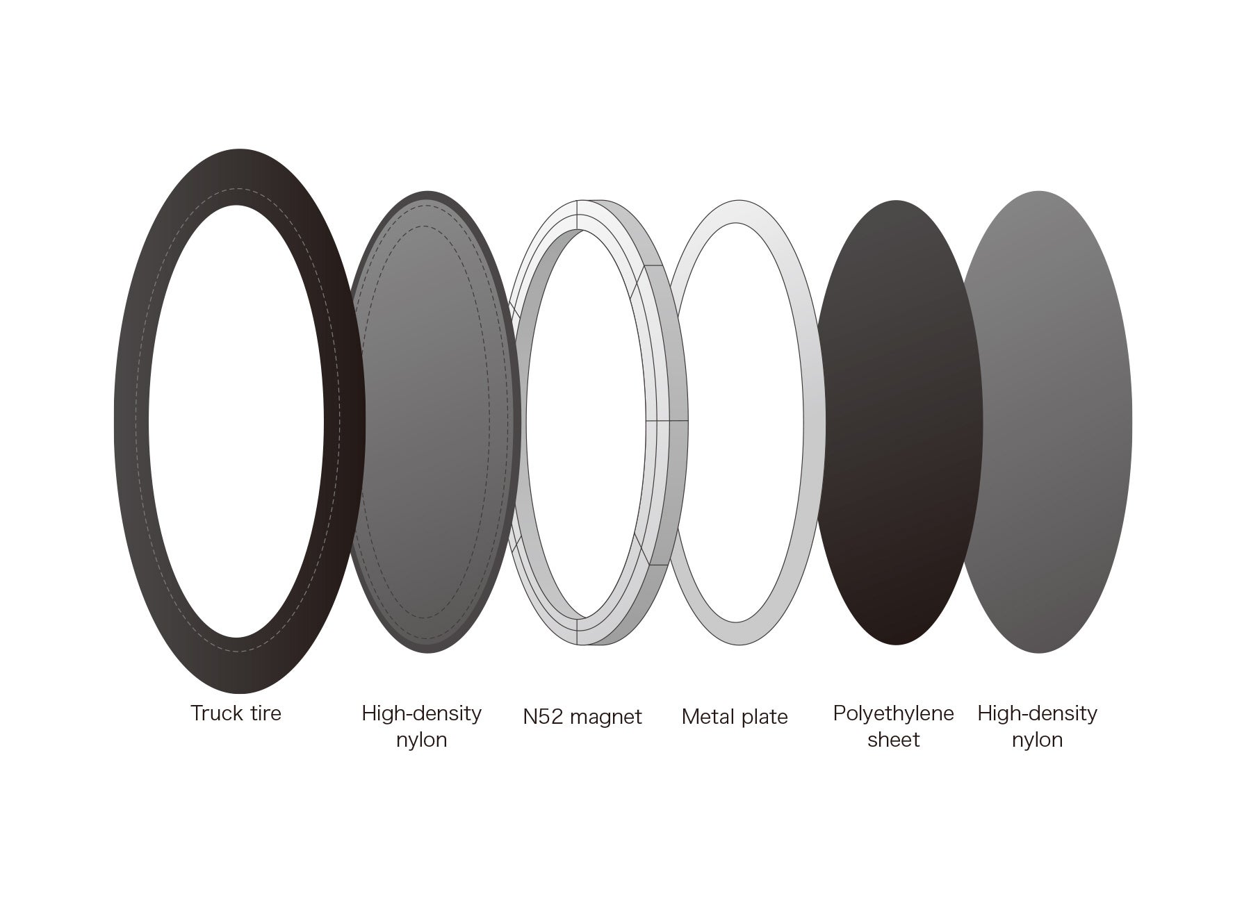 MagSafeと連結する機構には合計16個にも及ぶN52グレードの磁石を使い、高密度ナイロン・メタルプレート等で何層にも重ね合わせ、製品前面にはSEAL製品の象徴的、且つSDGsにも貢献する"廃タイヤチューブ"を採用。