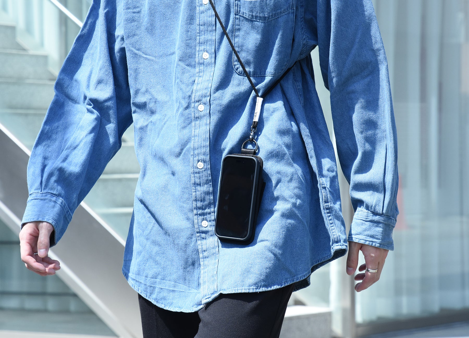 付属のショルダーストラップは、本製品と接続する事によりスマホショルダーとして利用する事ができる他、スマートフォンに大きな振動・衝撃が加わる可能性がある場合には付属のストラップホルダーとカラビナを使用いただく事により、万が一の落下の際にも安心して使うことが可能です。