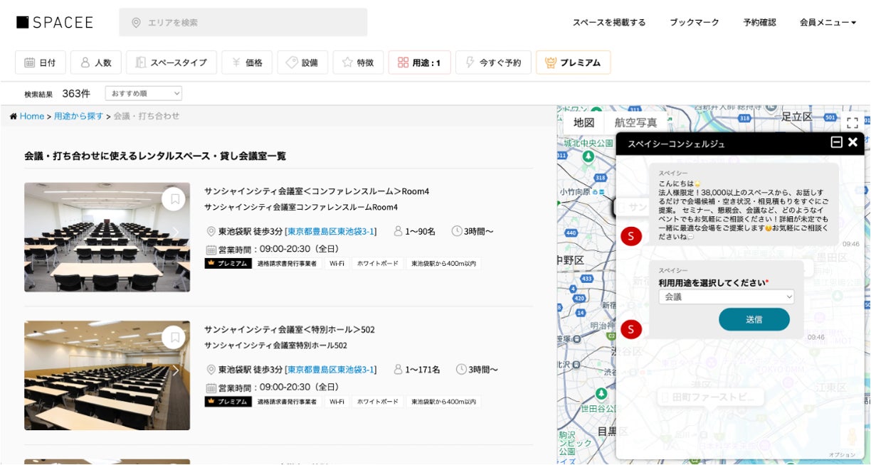 「スペイシーコンシェルジュ」は、株式会社エイチが提供する「会議室手配プラットフォーム」の機能を活用し、提携する全国38,000件以上のスペースの中から、顧客のニーズに最適な会場を提案するサービスです。