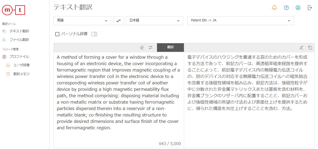 このたび発売する特許専用AI翻訳モデルは、NTTドコモの子会社であるみらい翻訳がNTTの特許コーパス3億文(*2)を学習させて構築した特許専用翻訳モデルを、AI自動翻訳エンジンに搭載したものです。特許関連文書の翻訳結果について複数の他社機械翻訳と比較を行い、最も精度が高いという評価を獲得しました。