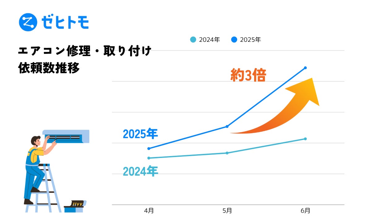 くらしのマッチングサービス「ゼヒトモ」を提供する株式会社Zehitomo(本社:東京都品川区、代表取締役:三浦雄一郎、以下「当社」)は、エアコン修理・取り付けに関する2025年5〜6月の依頼動向をまとめた最新データを発表しました。