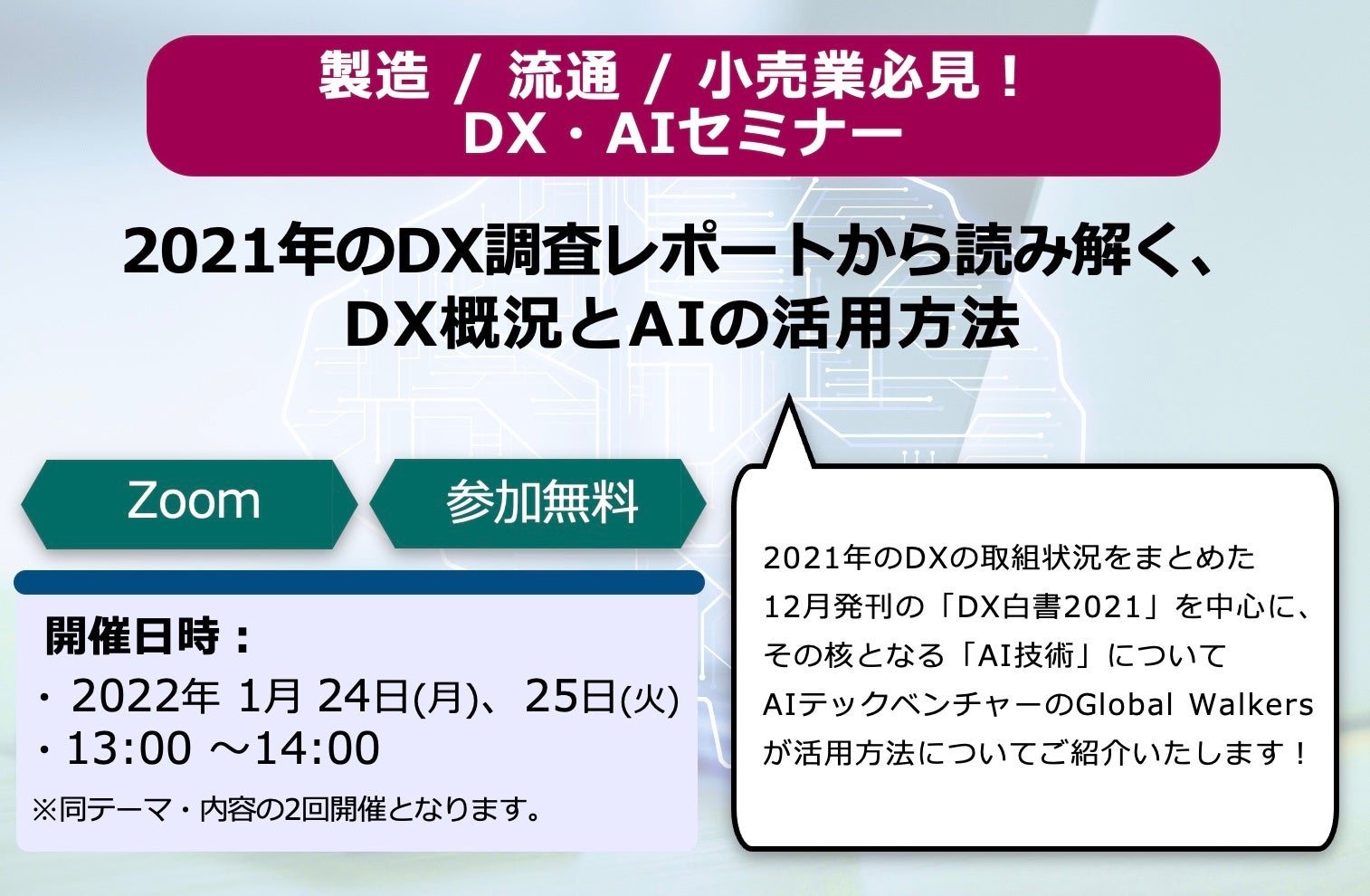 【製造/流通/小売業必見!】Global Walkers主催 無料AIウェビナー「2021年のDX調査レポートから読み解く、DX概況とAIの活用方法」開催のお知らせ