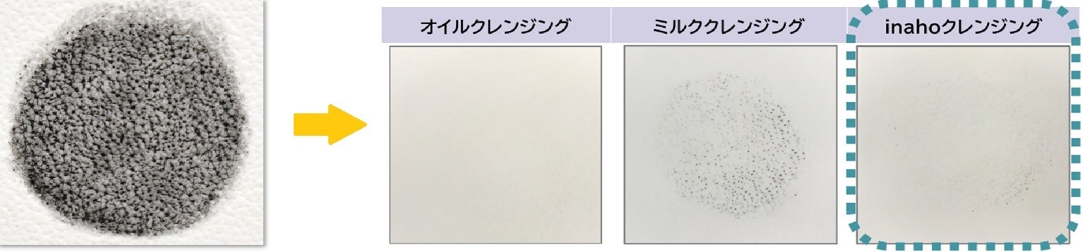 市販品ミネラルオイル系が最も落ちやすいが、天然由来のinahoクレンジングオイルでも乳化させると十分な洗浄力を確認いたしました。