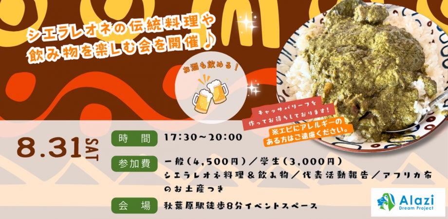 シエラレオネ共和国での活動を専門とする特定非営利活動法人Alazi Dream Project(本社:東京都新宿区、代表理事:下里夢美(しもさとゆめみ)、以下NPO法人アラジ)は、女の子が若年妊娠・出産によって教育機会からの離脱を余儀なくされる現状を、教育機会を妨げる最たる社会問題と捉え、復学の支援、及び性教育の普及を通じて問題の根本解決に取り組んでいます。地球の裏側、日本から遠く離れたシエラレオネに想いを馳せ、家庭料理「キャッサバリーフシチュー」をお召し上がりいただける交流会を8月31日(土)17:30~20:00 秋葉原にて開催します。
