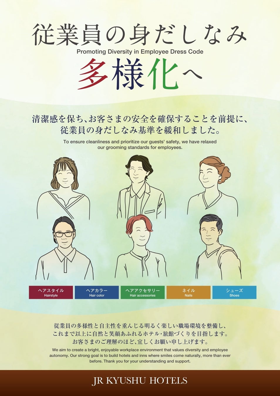 JR九州ホテルズ株式会社(本社:福岡県福岡市、代表取締役社長:角谷 英彦)では、従業員が自由な発想で楽しく働ける環境づくり、多様性を認めあう企業風土の醸成によるゲストエンゲージメント向上と、多様な人財の採用力強化を目的に、8月1日(木)より、身だしなみルールを緩和いたします。