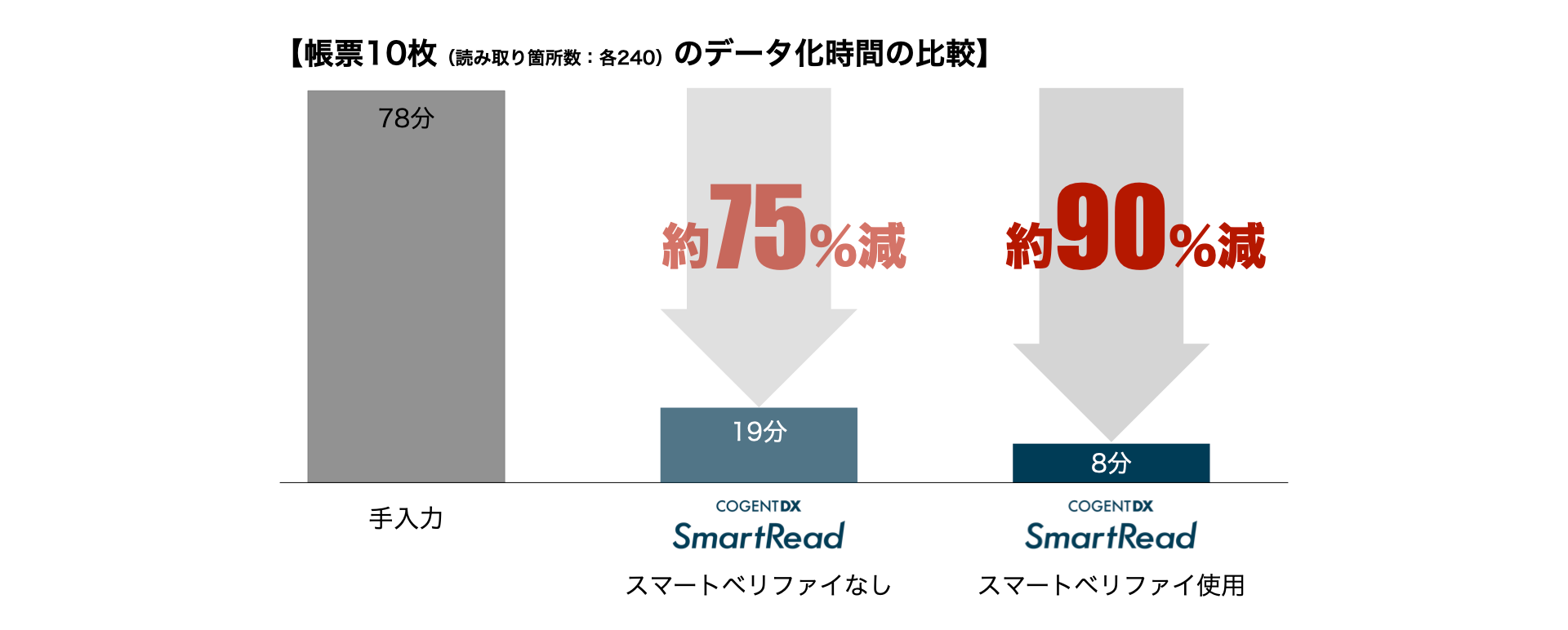 コージェントラボが実施した検証では、スマートベリファイを使用することで、手入力と比較して約90%、スマートベリファイなしと比較して約50%、データ化作業時間を削減することができました。