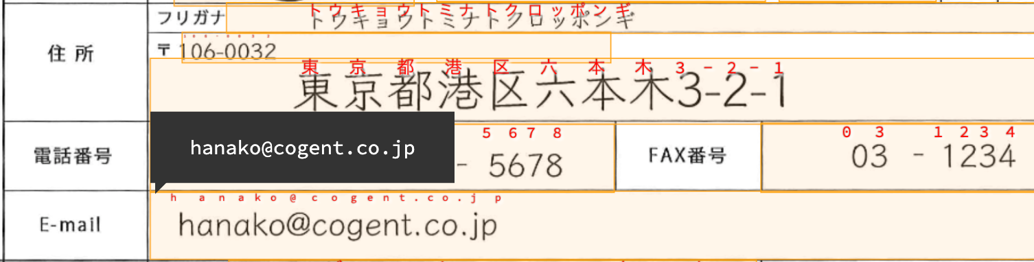各読み取り項目を個別に確認することなく文書全体を素早く確認したい場合は、文書レイアウト上に読み取り結果を重ねて表示することができます。例えば数値表など、多くの情報を含む密度の高い文書の確認に適しています。読み取り結果はレイアウト内の文字のすぐ上に配置され、0(ゼロ)とO(オー)、I(アイ)とl(エル)など、混同しやすい文字を区別しやすいフォントを使用しています