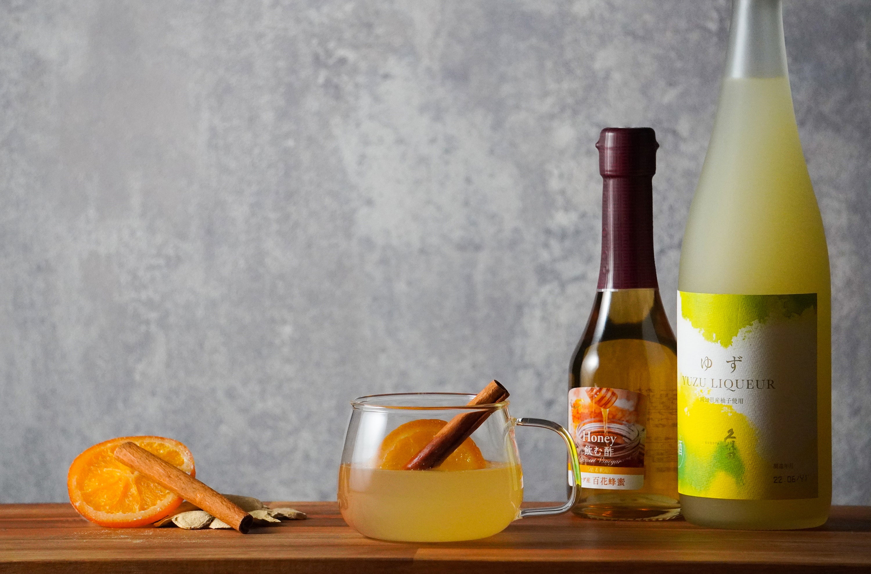 『久保田 ゆずリキュール』に「飲む酢・デザートビネガー・カナダ産百花蜂蜜」を加えたホットカクテル。ゆずに加えて、シナモンやジンジャーの香りが広がり、一口飲むだけでホッと温まる一杯です。普段お酒を飲まれない方にも飲みやすくおすすめです。