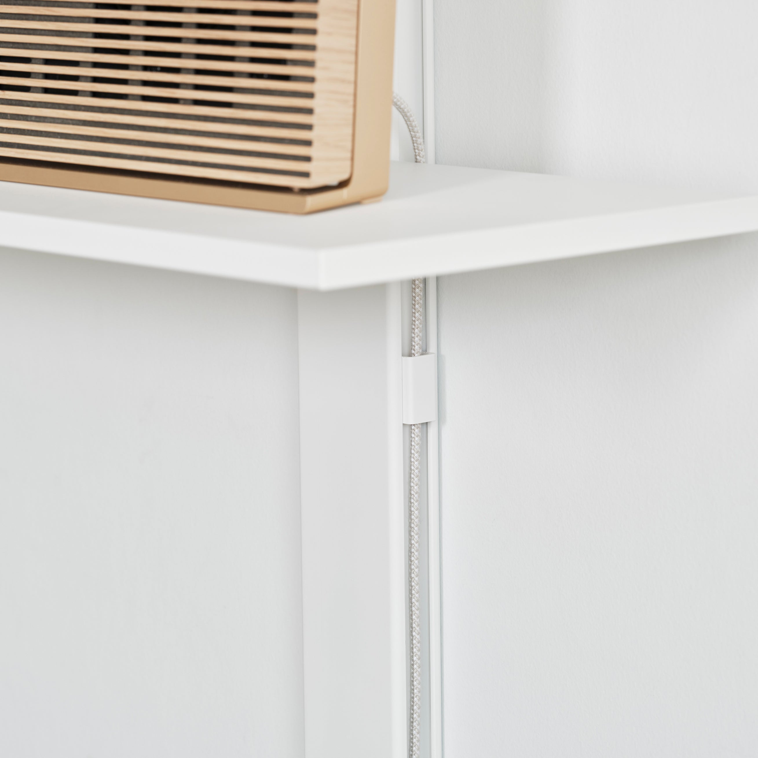 電気製品を多用する現代の暮らしを前提にデザイン。支柱の側面に溝を作り、棚板の背面にも凹みをつけることで、ケーブルをスマートに隠せます。これによってインテリアのために便利な暮らしを諦めることなく、心地よい棚を実現します。