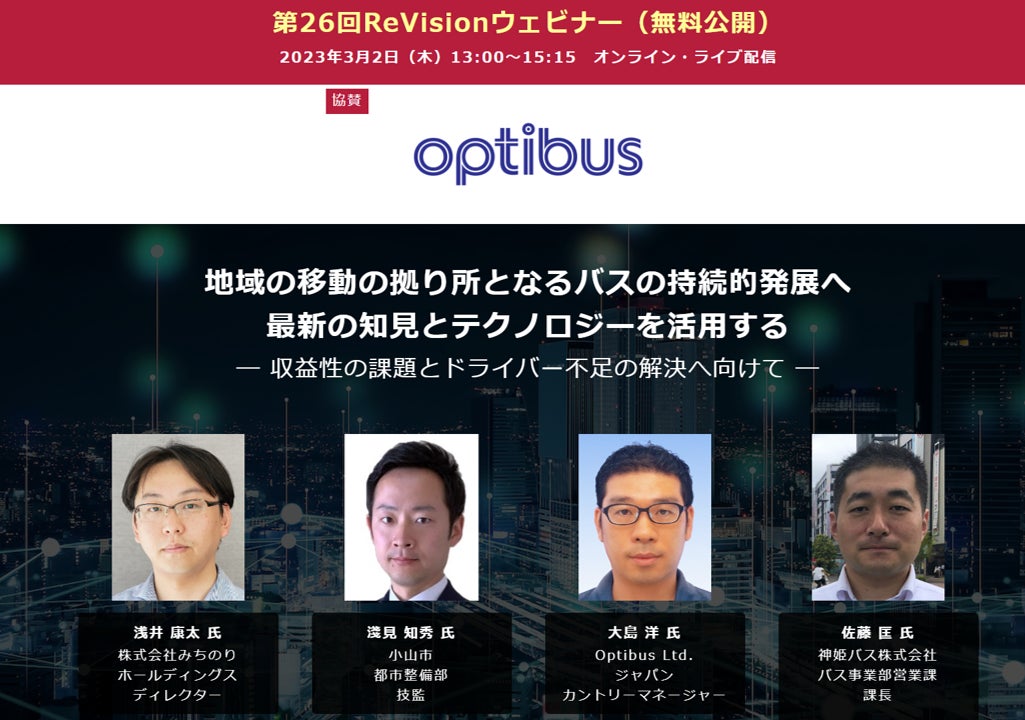 【無料WEBセミナー】 みちのりHD、小山市、神姫バス、Optibusから講師を迎え、「地域のバスの持続的発展へ知見とテクノロジーの活用」について無料ライブ配信 ― 3月2日(木)