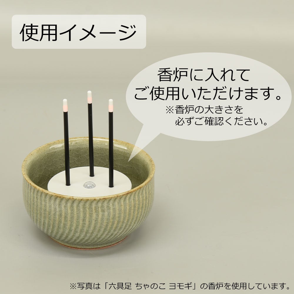 簡単に点灯・消灯の切り替えが可能で、リモコンによる遠隔操作にも対応しています。本物のお線香やローソクのように光が揺らぎ、明るさの調節も可能です。すでにお使いの香炉や火立の中に入れてご使用いただけます。