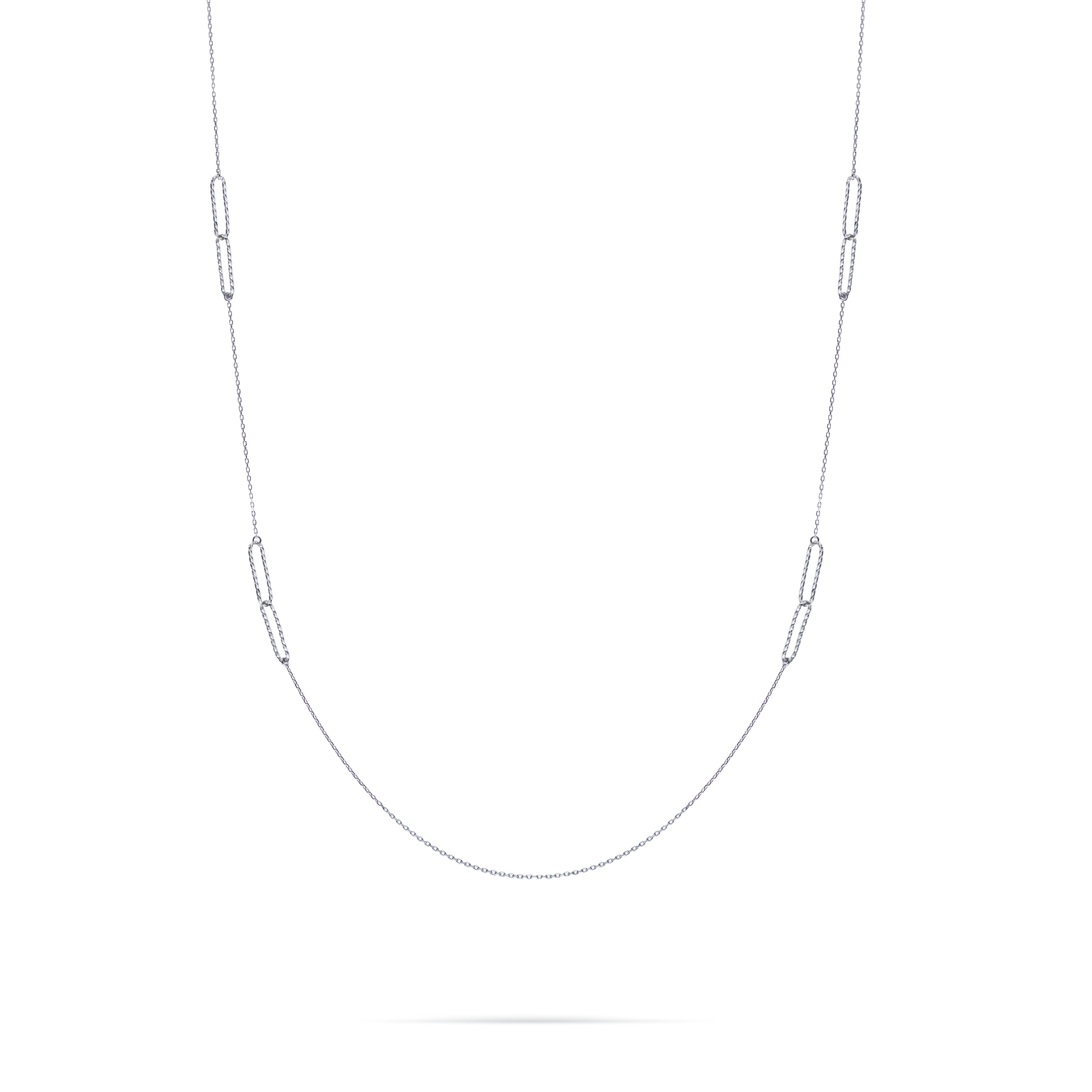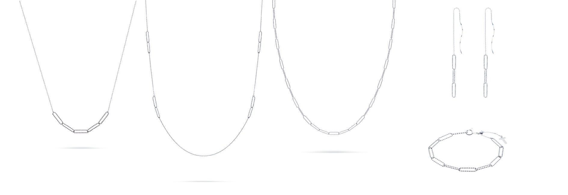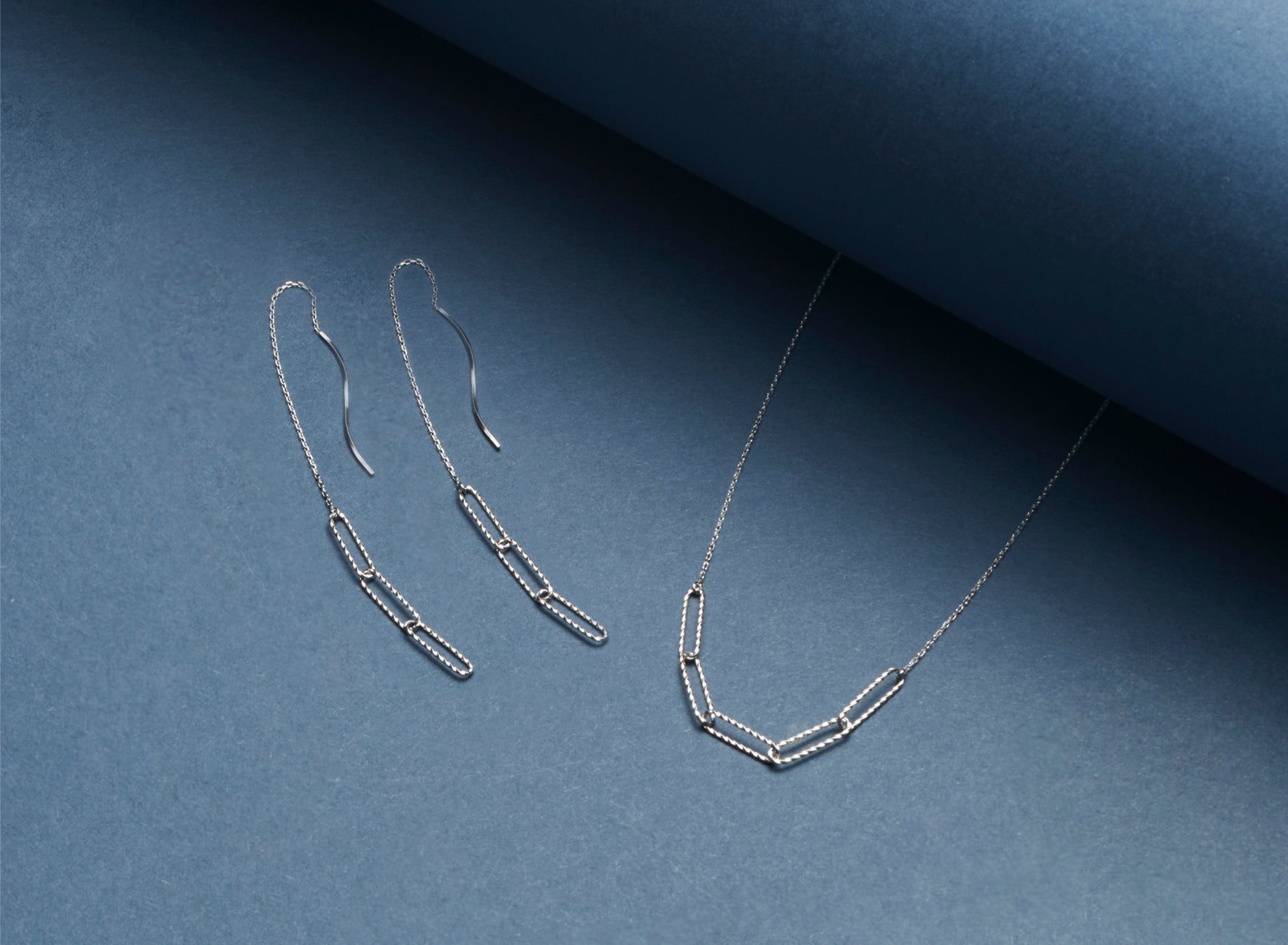デイリーユースにぴったりでモダンな印象の新作ネックレス(約45cm)は、新作ロングネックレス(約70cm)と一緒に着けても相性がよく、トレンドのレイヤードスタイルも楽しめます。ピアスはフェイスラインを華やかに彩るアメリカンタイプです。ほどよいボリュームの揺れるデザインで、繊細なきらめきを演出します。その他にトラック型のパーツを全周にあしらった約50cmのネックレスと長さ調整ができるブレスレットも発売します。