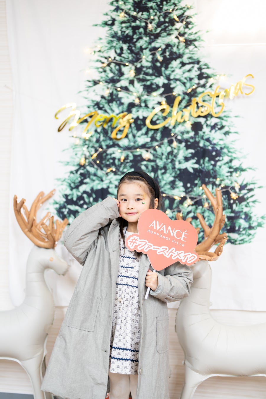 クリスマスらしいツリーの装飾と、ファーストメイクのロゴパネルを配したフォトブースで写真撮影。
