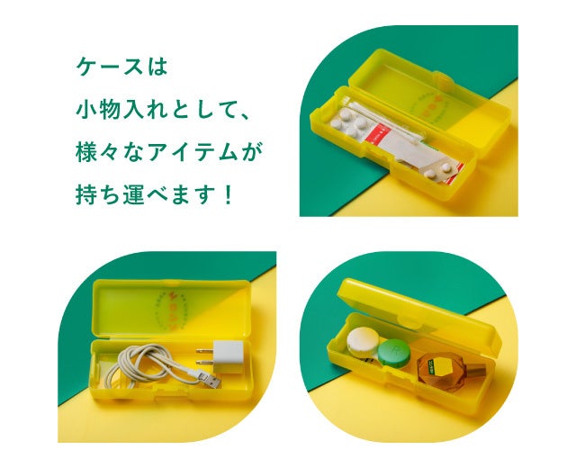 まるでケロリン桶のようなデザインの、持ち運びに便利な専用ケース付き!