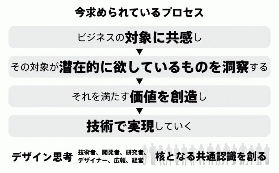 技術はあくまで「手段」。どういう人に向けて、どういう価値を創り、どういう風にキャッシュが流れるのかという市場からの一連のロジカルな設計が必要です。ビジネスの対象に共感し、その対象が潜在的に欲しているものを洞察する。それを満たす価値を創造し、技術で実現していく。これが今求められているプロセスです。