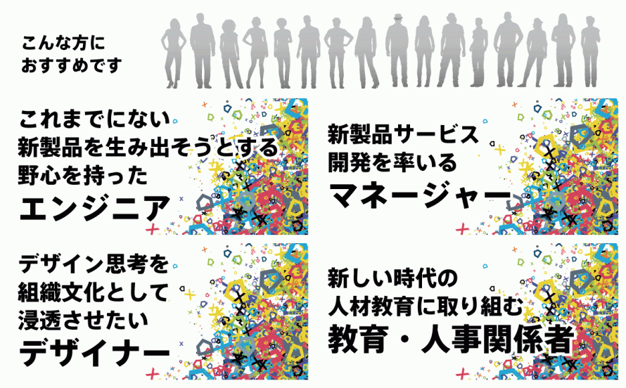 教育・人事関係者 →デザイン思考とはどのようなものか、どんな効果があるのかを体感します。