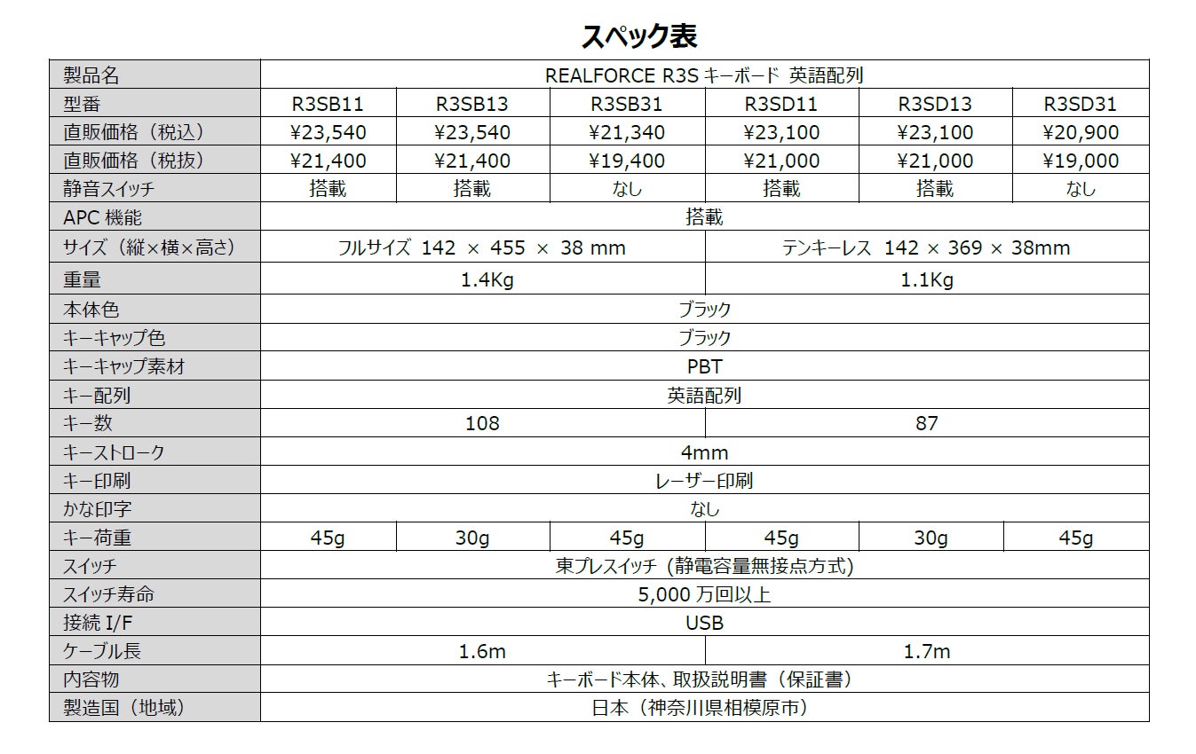 東プレ株式会社(代表取締役社長:山本 豊 本社所在地:東京都中央区日本橋) は、REALFORCE(リアルフォース)ブランドのマスターシリーズ 「R3Sキーボード」の英語配列モデル6製品を2022年10月11日(火)に発売します。製品価格は、フルサイズの標準モデルが21,340円(税込)、フルサイズの静音モデルが23,540円(税込)、テンキーレスの標準モデルが20,900円(税込)テンキーレスの静音モデルが23,100円(税込)です。
