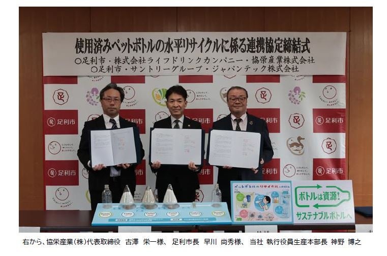 株式会社ライフドリンク カンパニー(本社:大阪府大阪市、代表取締役社長:岡野 邦昭)は、2024年2月20日に栃木県足利市とペットボトルの「水平リサイクル(ボトルtoボトル)※」に係る連携協定(以下、本協定)を締結しましたので、お知らせいたします。