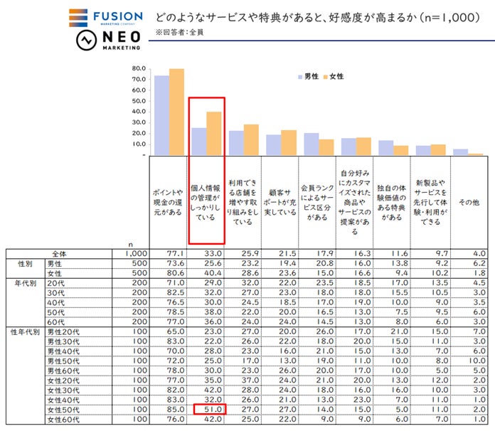 また、【何があれば新しいポイントサービスに参加したいと思うか】での結果と同様に、やはり女性の方がセキュリティ性の高さに好感を抱きやすい傾向があり、50代女性の場合は51.0%にも上りました。