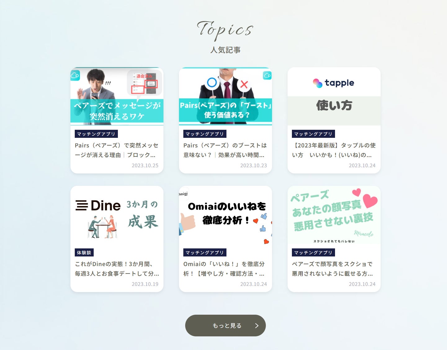 基本的なマッチングアプリの使い方や料金はもちろん、実際にマッチングアプリを利用している方の体験談や企業へのインタビューなど、みなさまのお悩み・ちょっとした疑問を解決できるように、各記事を更新しております。