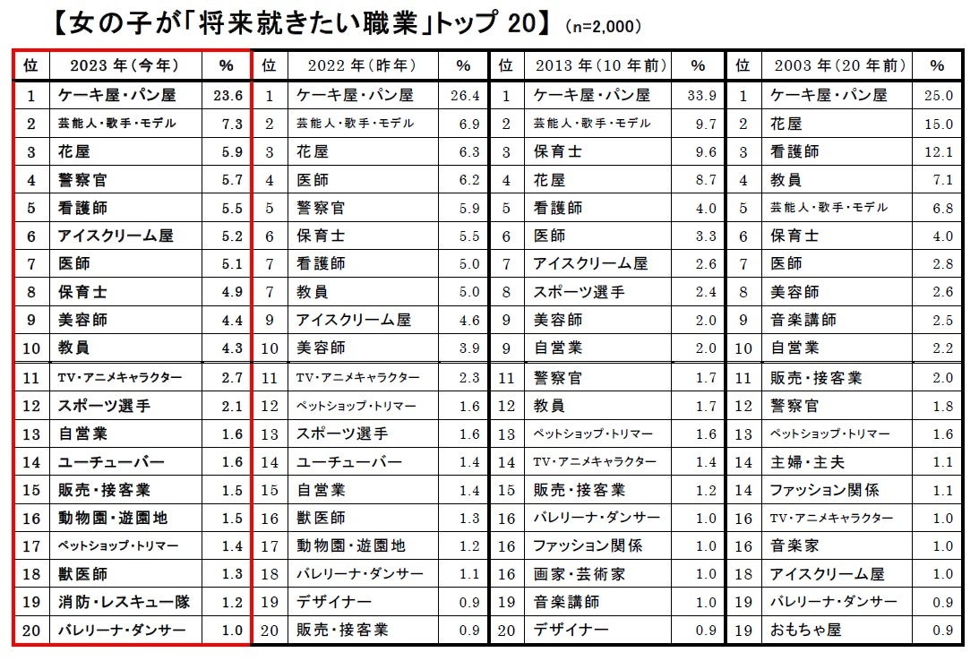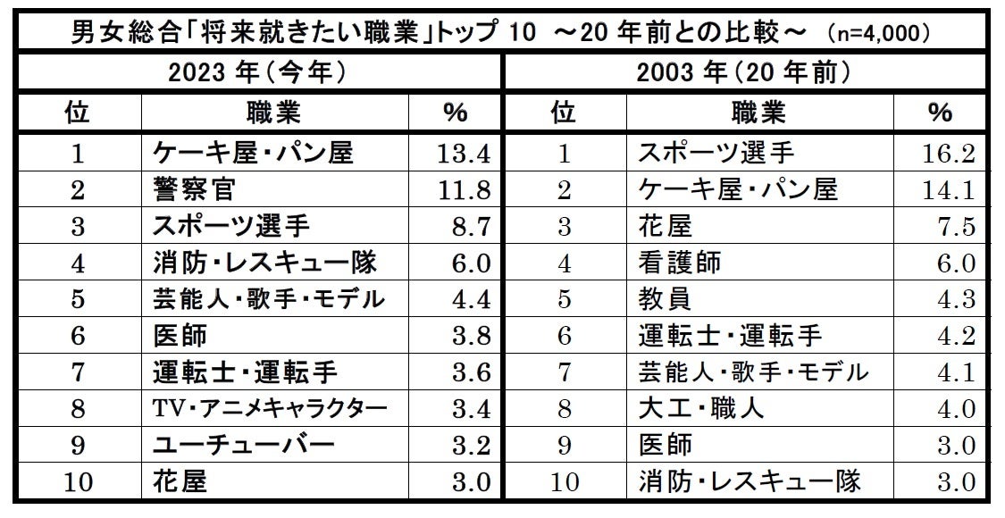子どもの将来就きたい職業は、「ケーキ屋・パン屋」が男女を合わせた総合1位となりました。2位の「警察官」は男女両方で年々増えており、今年は1位と1.6ポイント差に迫っています。20年前(2003年)の調査と比較すると、「警察官」は約4倍、「消防・レスキュー隊」も2倍に増え、人や街を守る仕事への関心が高まっていることがうかがえました。一方で、圧倒的人気だった「スポーツ選手」は半減しました。