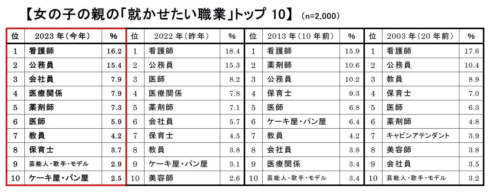 毎年人気の「看護師」は、3年連続で過去最高比率となった2位「公務員」との差が縮まりましたが、今年も1位をキープしました。「会社員」が昨年から大幅に比率を伸ばして過去最高の3位となり、男の子の親と同じく、安定を求める傾向が高まっているようです。