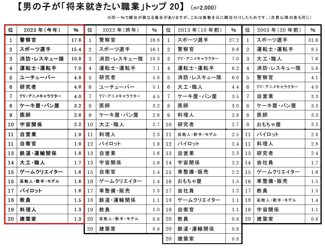 ~男の子1位は3年連続で「警察官」、「ユーチューバー」が初のトップ5入り~ ~女の子1位は25年連続で「ケーキ屋・パン屋」、「警察官」が過去最高の4位~