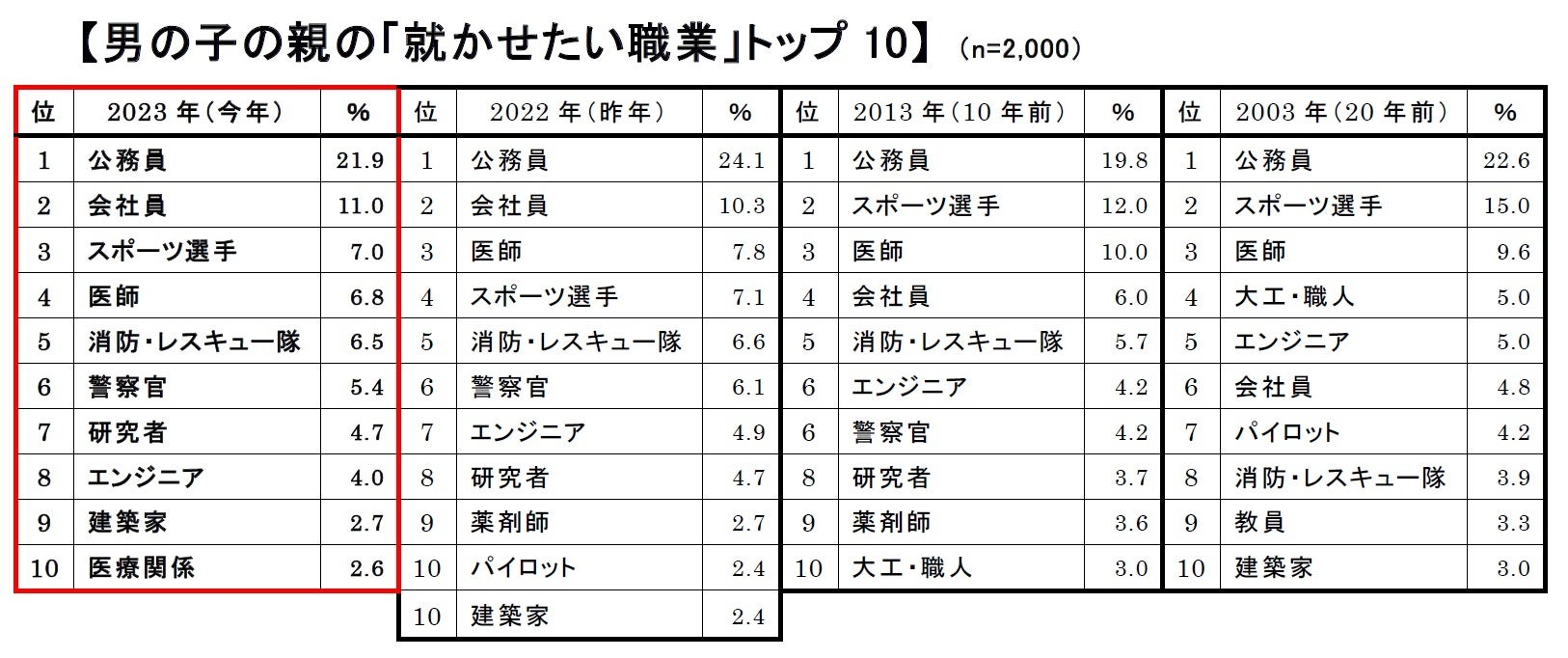 トップは今年も「公務員」、「会社員」は過去最高比率で安定求める傾向