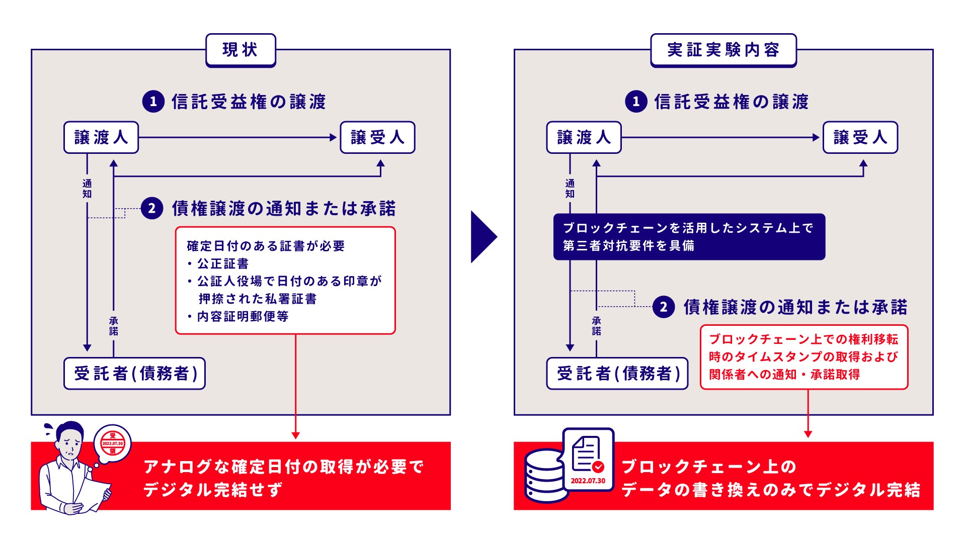 本実証実験ではこの問題を解決するため、規制のサンドボックス制度(※2)を利用し、電子的な帳簿記録の更新のみで第三者対抗要件を具備したシステムを開発することで、債権譲渡のプロセスをデジタル化することを目指します。