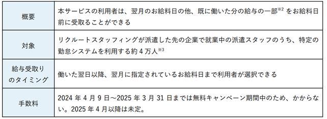 本サービスは、本日より株式会社リクルートが中堅・大企業に提供を始めた「Airワーク 給与支払」を導入したもので、これにより、リクルートスタッフィングが派遣した先の企業で就業中の派遣スタッフのうち、特定の勤怠システムを利用する約4万人が、希望に応じて、実際に働いた分の給与の一部をお給料日前に先払いで受取ることが可能となります。