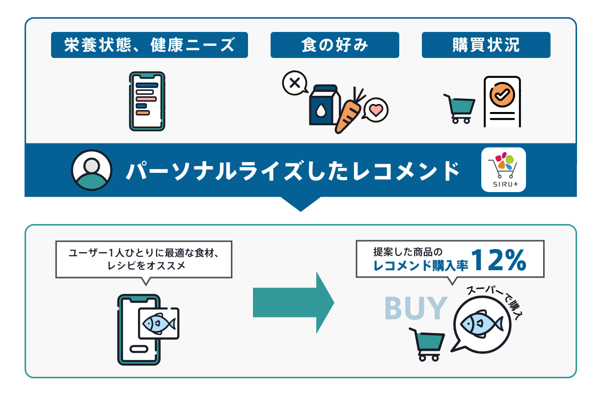 「SIRU+」はユーザーの栄養状態、食の好み、購買状況、食材の旬などをもとに、各ユーザーに最適な食材やレシピを提案します。「自身や家族の健康」という、自分ゴト化しやすい切り口での提案ができるため、購買意欲の向上につながりやすく、アプリで提案した食材のレコメンド購入率(※)は12% となっています。
