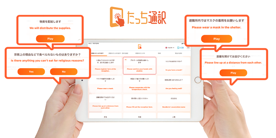 災害発生時においては通信が混雑するケースや、通信インフラがダウンする可能性も想定されます。「たっち通訳」では全ての操作をオフライン(インターネットに繋がっていない状態)で利用でき、避難所の入所受付から入所中の生活支援や退所手続きまでの主要なコミュニケーションをサポートすることが可能です。