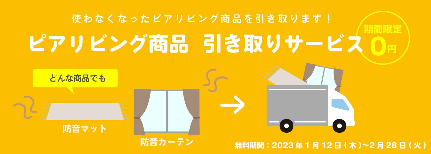 株式会社ピアリビング(代表取締役:室水房子)は、同社で購入された使用済み防音商品の引き取りサービスを開始します。引越しシーズンを前に2023年1月から全国を対象に開始いたします。1月12日(木)〜2月28日(火)まで、期間限定で0円(※)でサービスが受けられます。そして年内には、使用済み商品の再利用サービスも開始する予定です。
