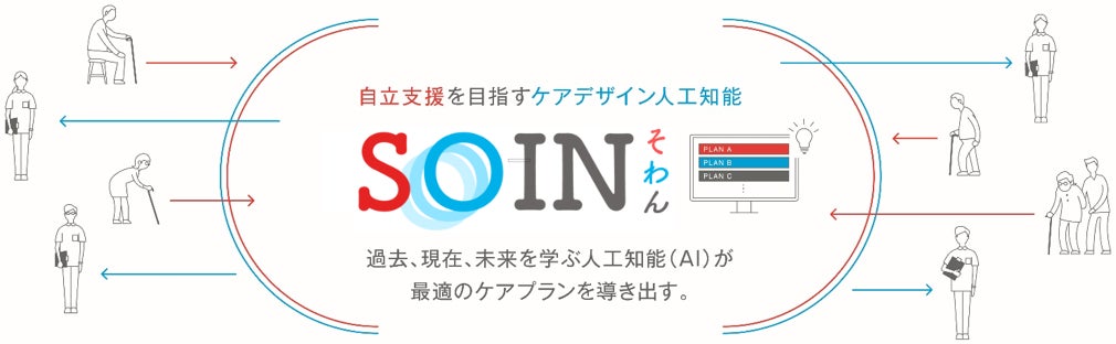 『SOIN』は、AIが学習した自立支援の事例を含む膨大なデータをもとに、現在の高齢者と状態像が近い過去の高齢者の事例を抽出し、要介護状態の維持または改善に寄与するケアプランの提案を行います。ケアマネジャーはAIから提案されたプランや将来の状態予測を参照しながら、自身が作成したケアプランと比較し、より質の高いケアプランを作成することができます。また、「生成系AI活用機能」「適切なケアマネジメント手法への対応機能」等でケアマネジャー業務の支援機能を更に強化しております。