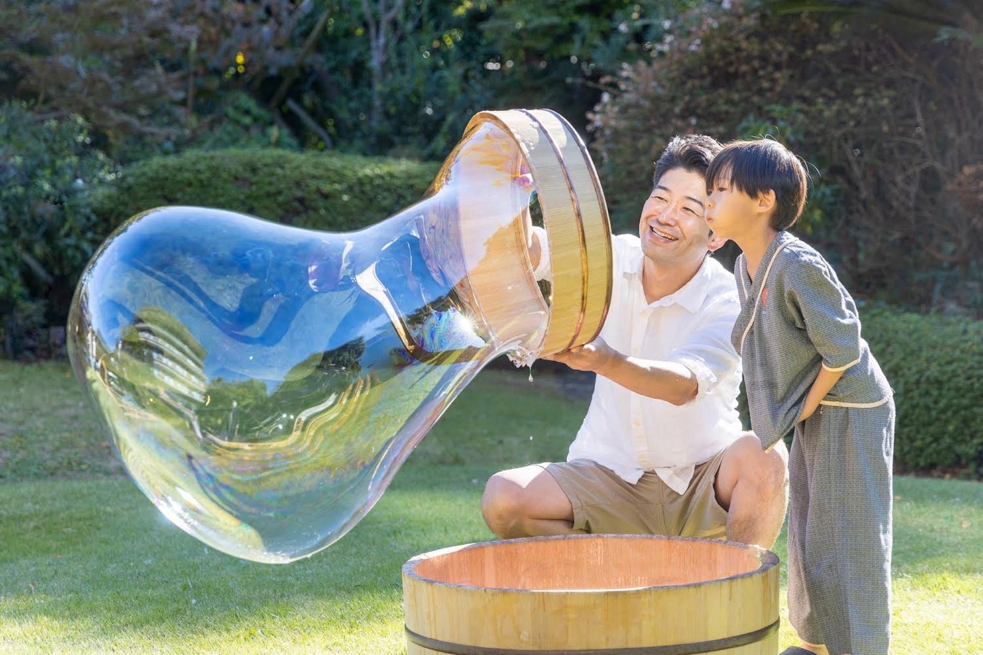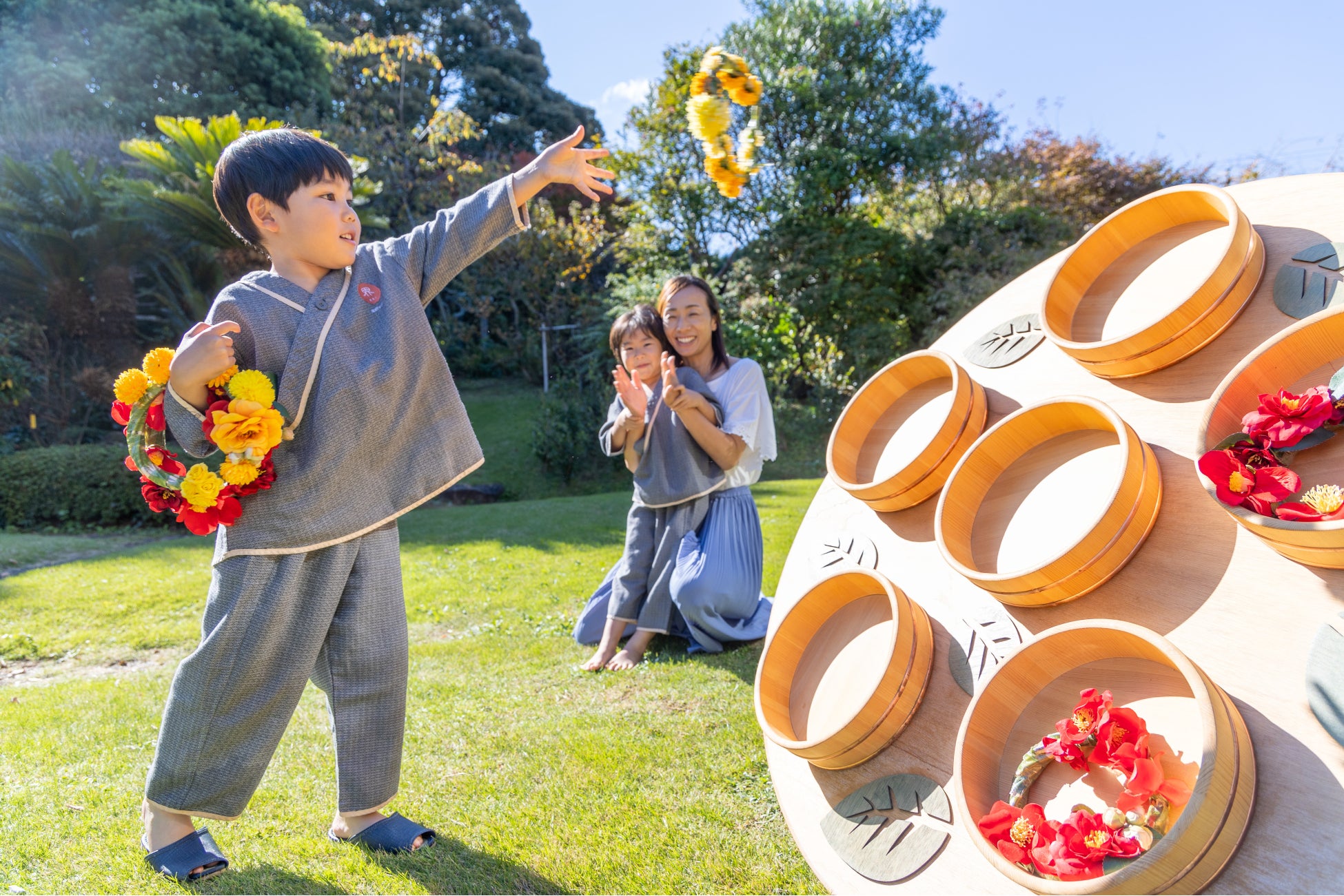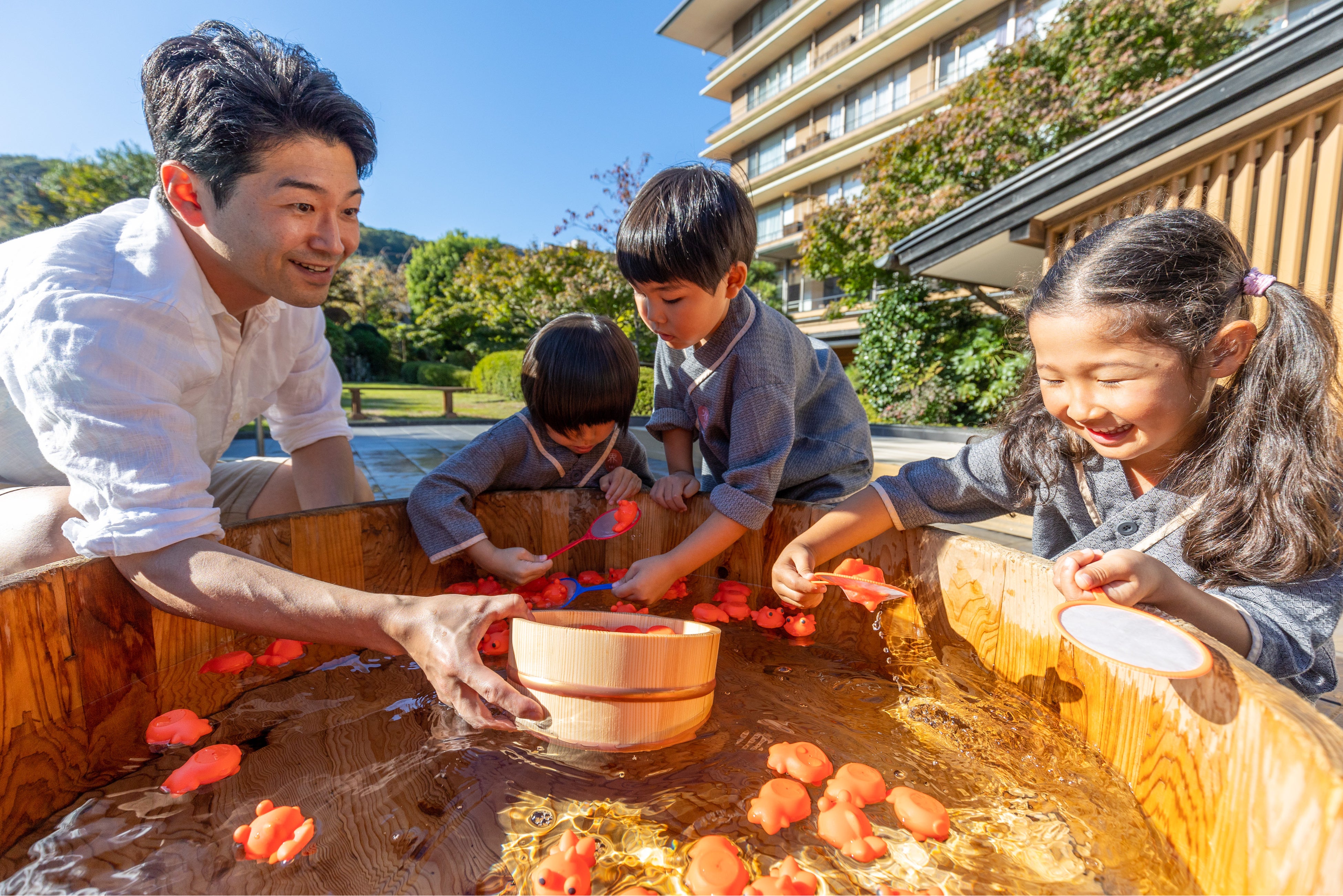 かつて伊東市・松川沿いに並んでいた旅館では、たらいで洗濯をする習慣があり、たらいで川下りの速さを競う「松川タライ乗り競争」という行事は約60年以上続く伊東市の夏の風物詩となりました。界 伊東では地域の伝統にならい、源泉プールでたらいに乗る体験ができます。子供たちが大きなたらいに乗って一生懸命漕ぐ姿は、まるで一寸法師のようで、見守る大人もつい応援に力が入ります。